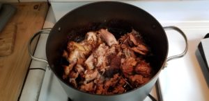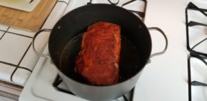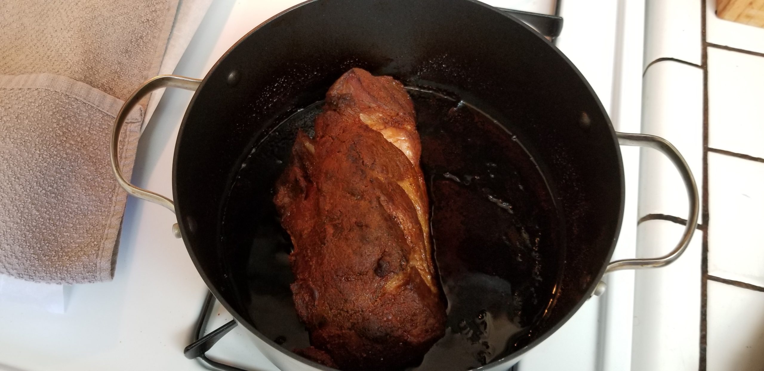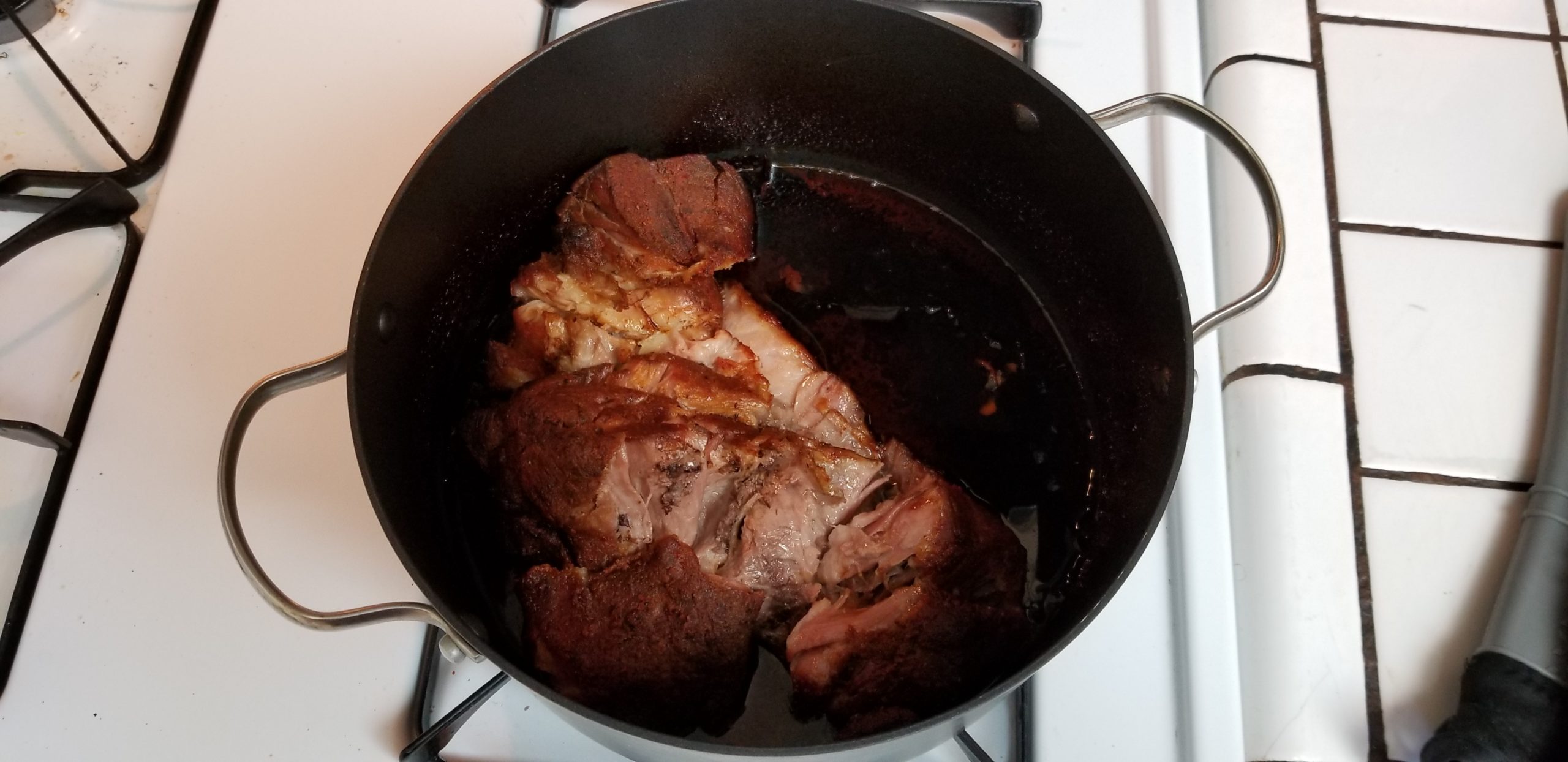 Now look at the bottom of the pan. Notice how the beer/dry rub and sugar turned the liquids a deep mahogany color? We’re going to use that shit.