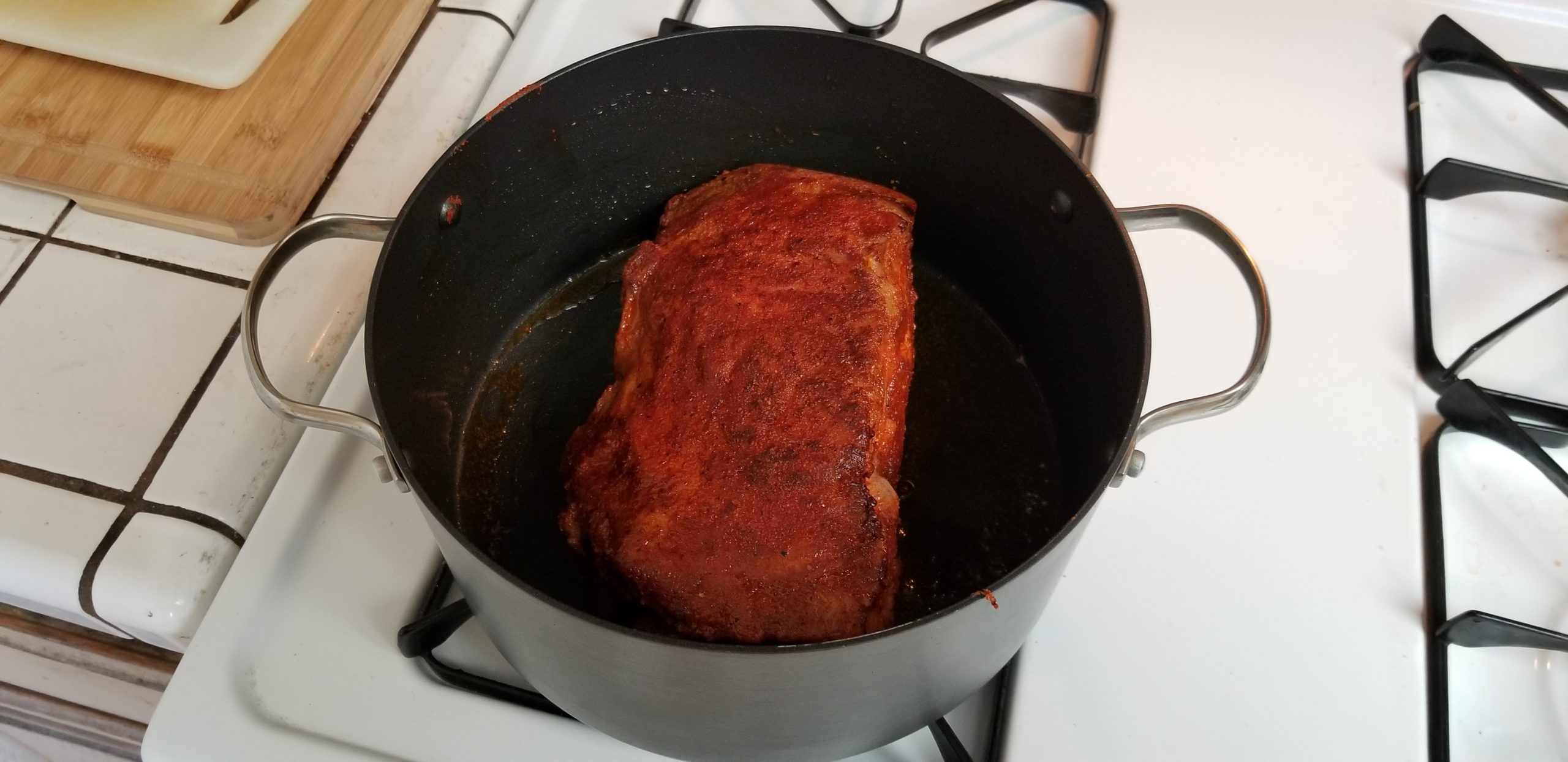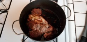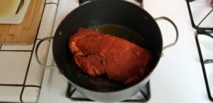 Take out your trusty Dutch oven and get over a medium heat. Pour a couple of tablespoons of oil into the pot and get that pig in there.