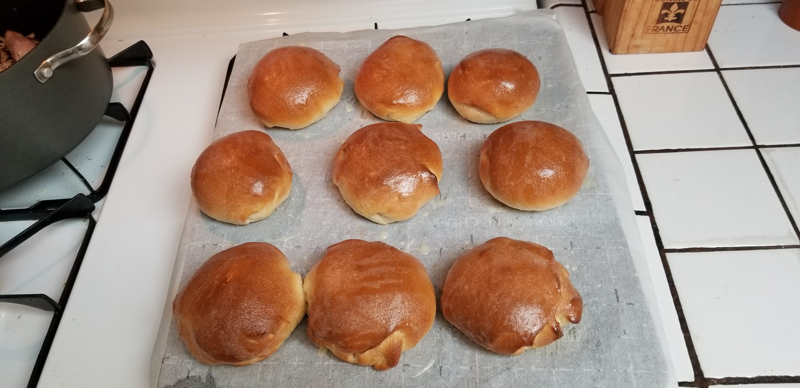 I timed this out so the final rise was done just as the 5 hours of pork roasting was finishing up. Remove the pork from the oven to let the juices settle, increase the oven temp to 375 degrees. When the oven is at temp, get those fabulous looking buns into the oven. Seventeen minutes should do.