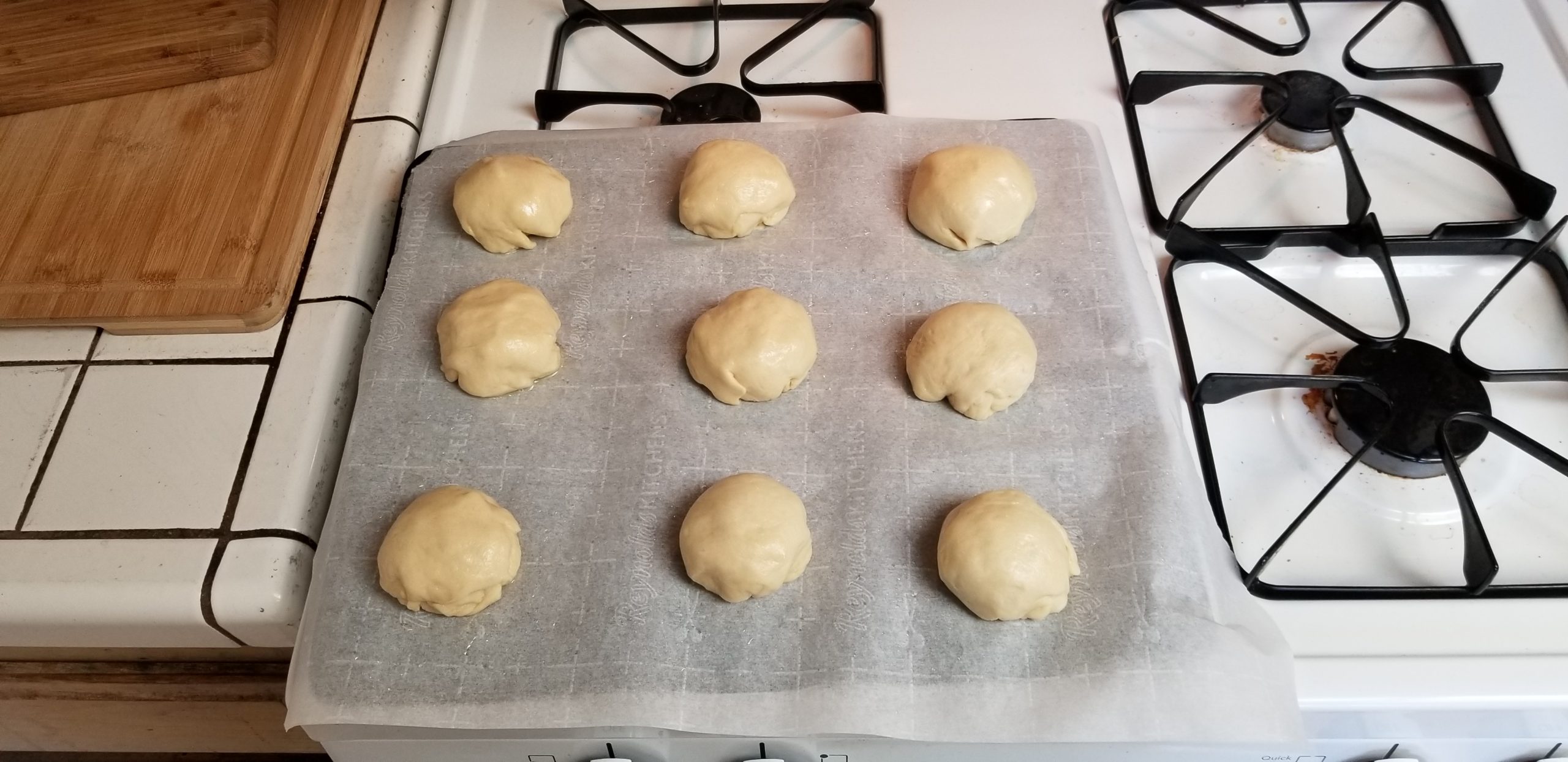 After the dough has risen, lightly punch down the dough and form into ball shapes. I made 9 buns today. I also placed the buns on a lightly lubed piece of parchment paper on top of a baking sheet. Having a mild sticking issue the last time making bread I decided to give this method a go.