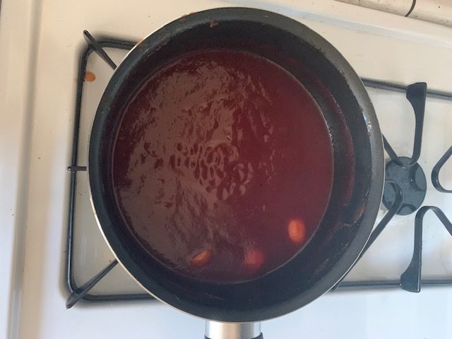Pan big enough to hold said juice bring just to boil, reduce heat, cover, simmer 1 hour (yes I said) 15 minutes, stirring every 10 minutes or else you’ll get sticky burnt shit, don’t do that, slow simmer.