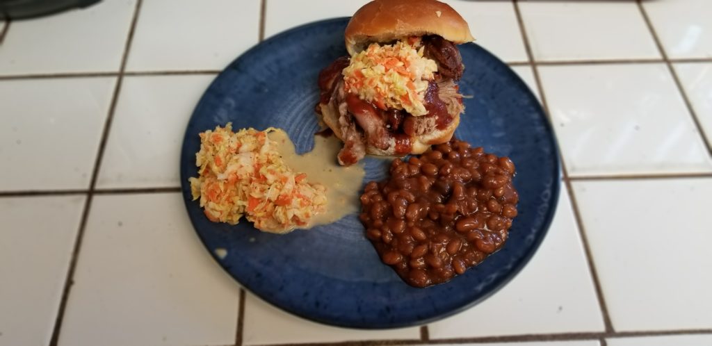 For full meal presentation, add a scoop of cole slaw, got some barbecue beans on hand? Get yourself some of them too. Today’s beans are courtesy of my favorite local Memphis style ‘cue joint in Culver City JR’s.