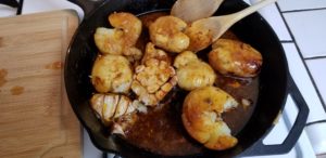 When I first read the recipe for this meal and saw it was cooked in cast iron, I had a little trepidation. Having experienced some chronic fucking sticking using sweet/spicy sauce combos in the past I really didn’t want anthing “sticky” to happen to my cast iron skillet.