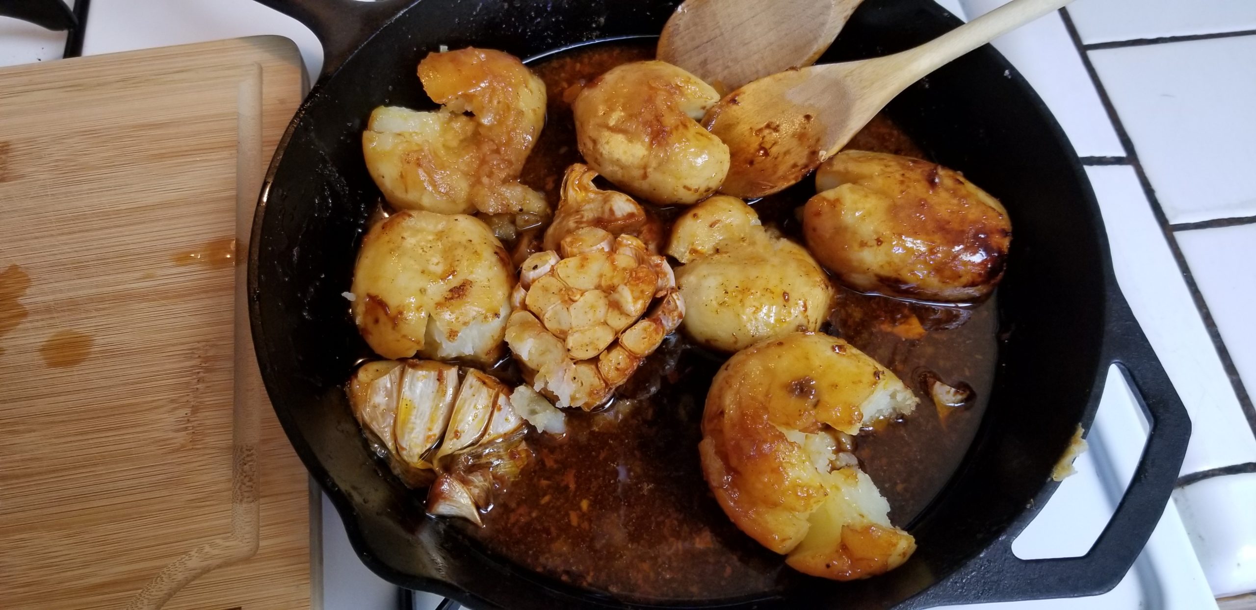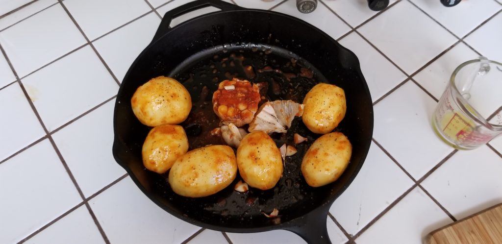 Place the potatoes and the 2 remaining halves of garlic in your cast iron skillet. You’re going to need a solid 12″ skillet here.