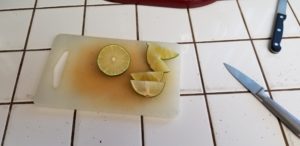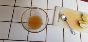 This is where we make the lime/honey solution. Place the honey in a small bowl and squeeze the juice from the remaining lime-half into the bowl with the honey.