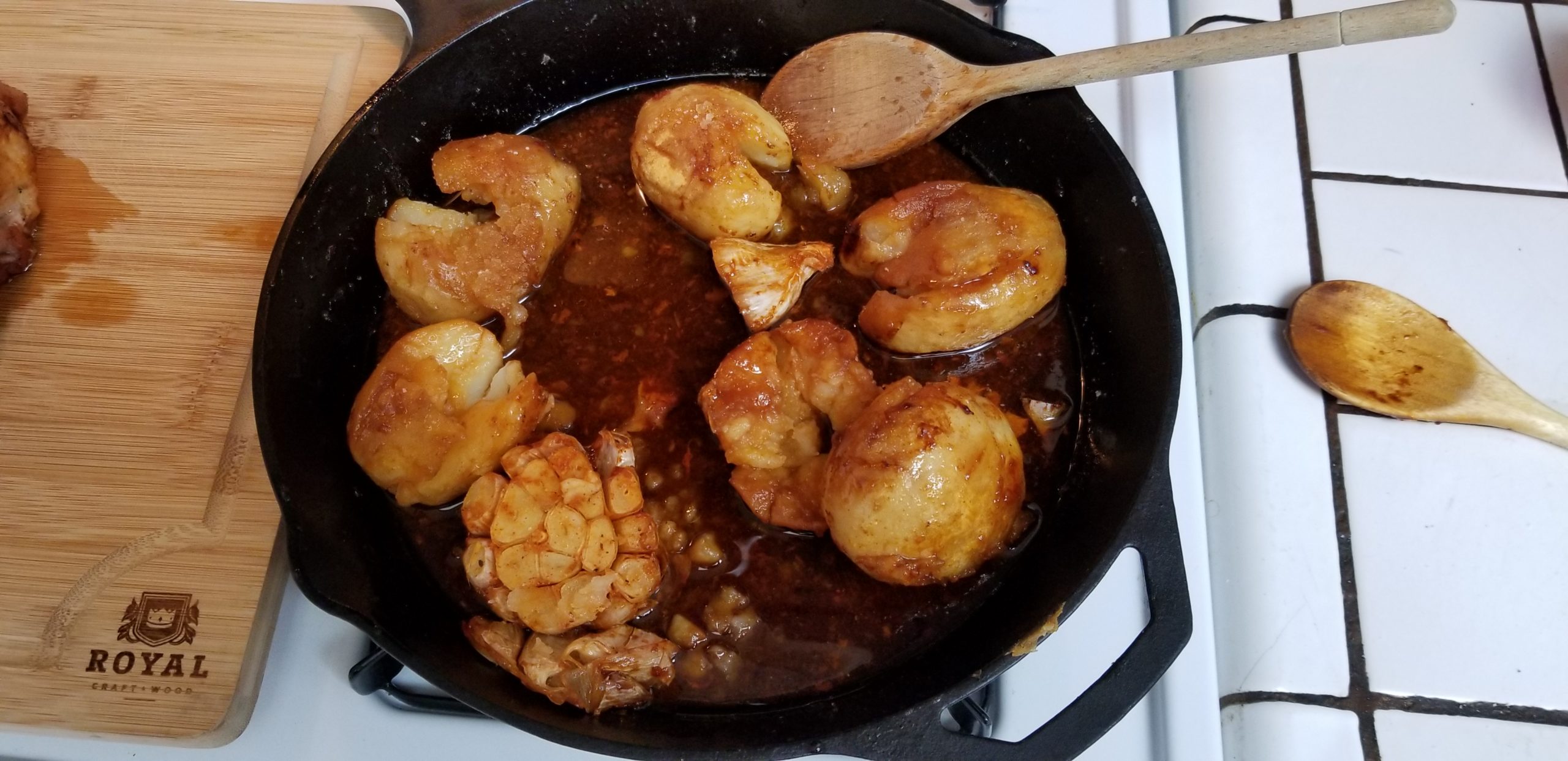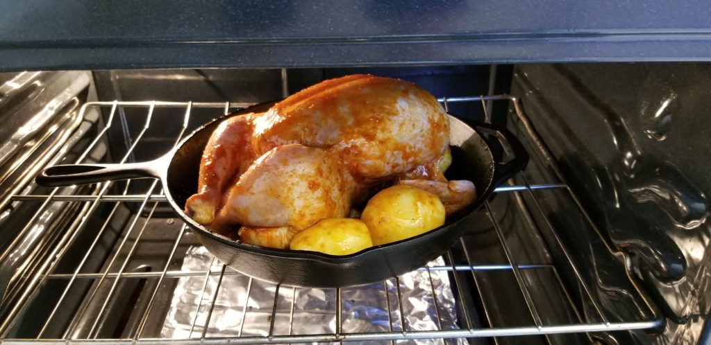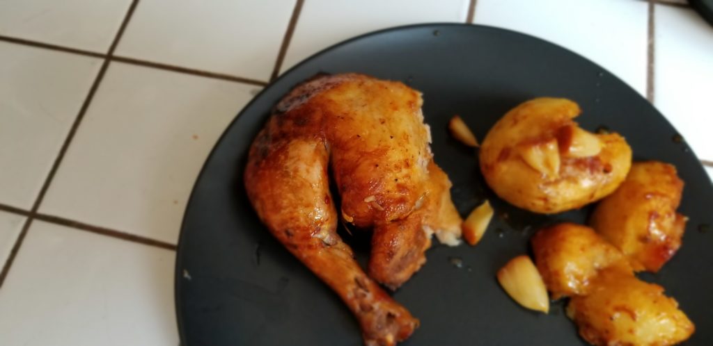 Make sure the chicken will be cooking on top of the garlic halves but not on top of the potatoes. Get them taters on the side of the chicken or you won’t have proper cookage.