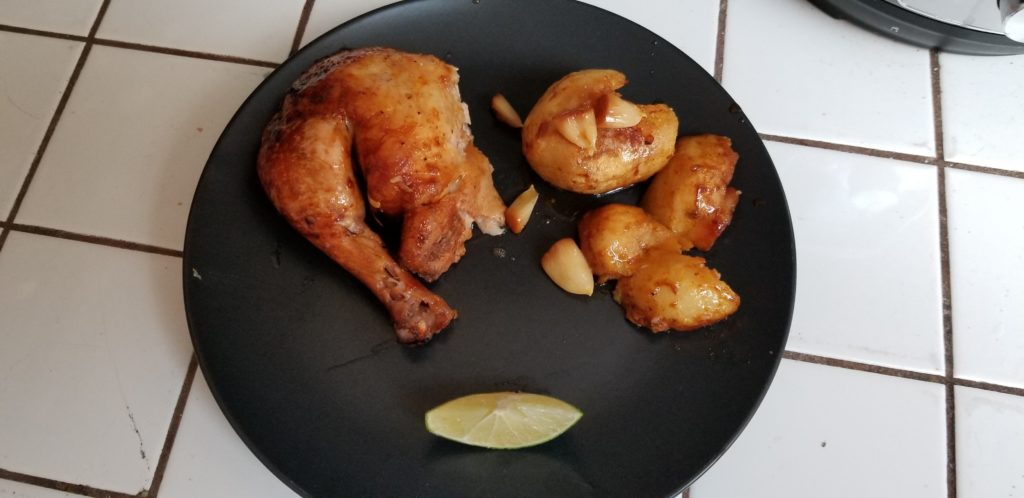 You may want to get a small bowl and ladle in some of the left over pan juices into it. It’s fucking special to dip pieces of the chicken in there. Also notice that I squeezed some of the what is now “roasted” garlic cloves right onto my plate as well.