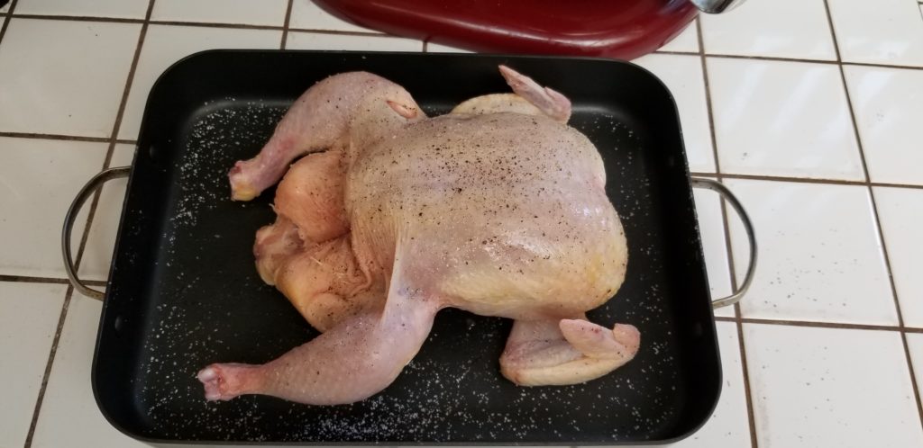 When working with a whole chicken you are going to need to be cognizant of a couple of things. First off there will be giblets, or the internal bits of the chicken (heart, liver, gizzard and maybe a spleen and such) already stuffed inside the chicken cavity. Remove before cooking and do with them what you will. They work in a stock, you can cook them up and eat them or feed them to the dog. Your choice.