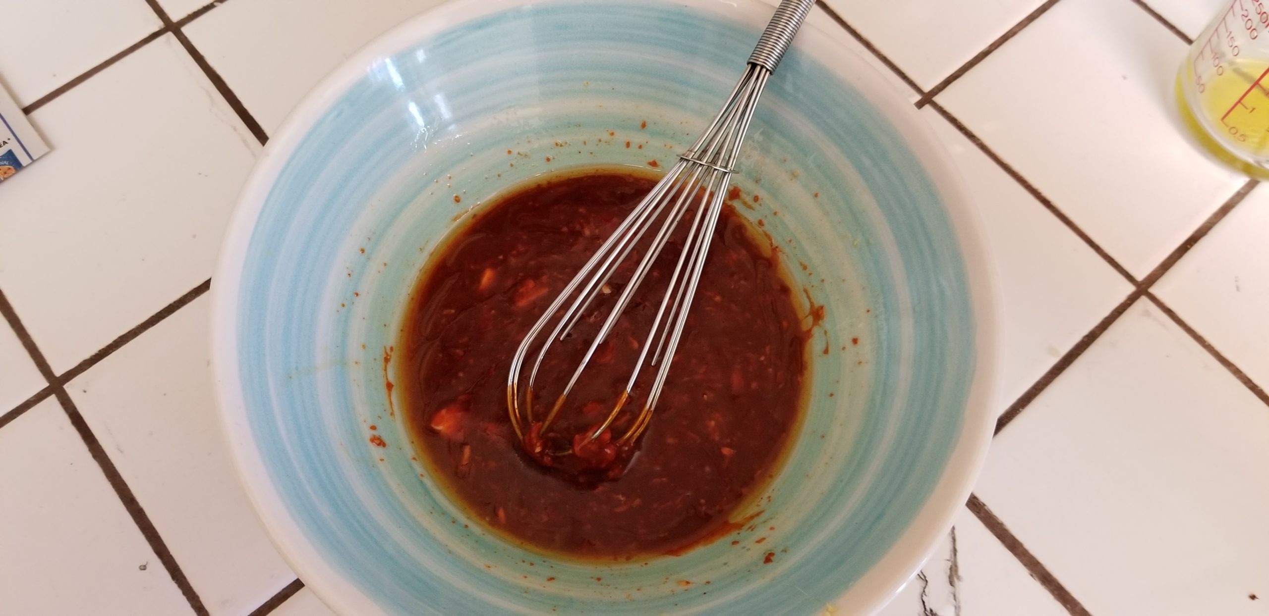 Take the gochujang and 1/4 cup of olive oil and whisk together in a bowl. Next we are going to add in the 3 cloves of minced garlic and the grated ginger. Whisk again. Use a basting brush and just slather that shit on the chicken.