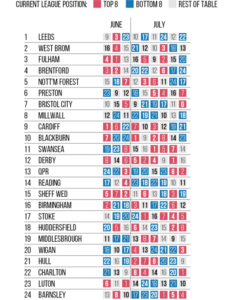 My club is in 3rd which is a playoff position and 6 points back of automatic promotion to the Prem. Leeds, and West Brom are above them, and Brentford is in 4th.