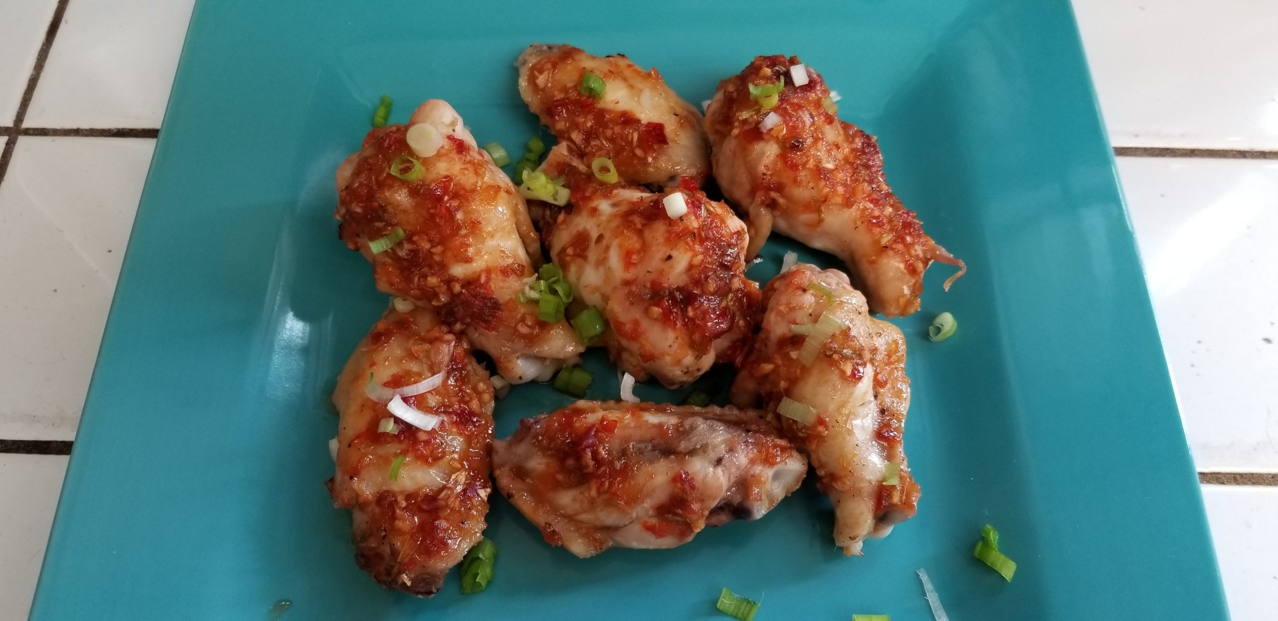 Grab a plate, get some wings on there, scatter some scallions on top.