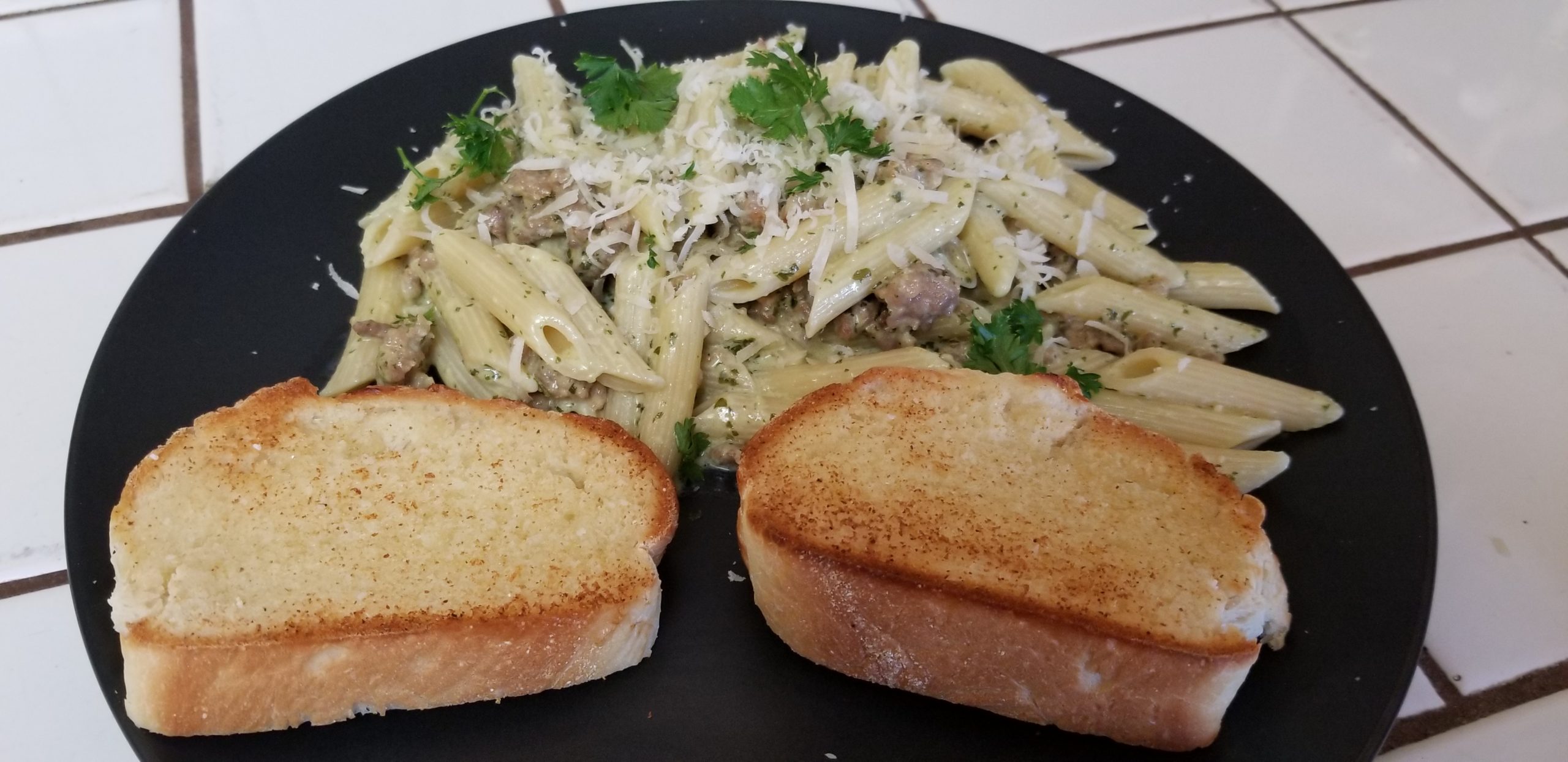 For final assembly add the browned sausage to the pesto cream sauce and cook until hot and bubbly.