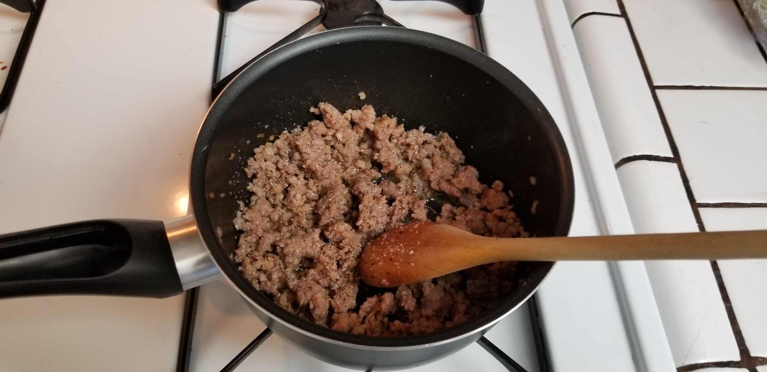 Get yer sausage into a skillet and give it a good browning. I seasoned with a bit of salt and pepper. This time we will indeed brown this shit thoroughly.