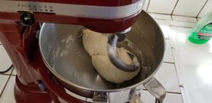 Add the yeast to the working bowl of your mixer then add in the water. Let bloom for a couple of minutes. Now add in the oil, salt, sugar and the first 2 cups of flour. Put your paddle attachment on the mixer and give it a spin.