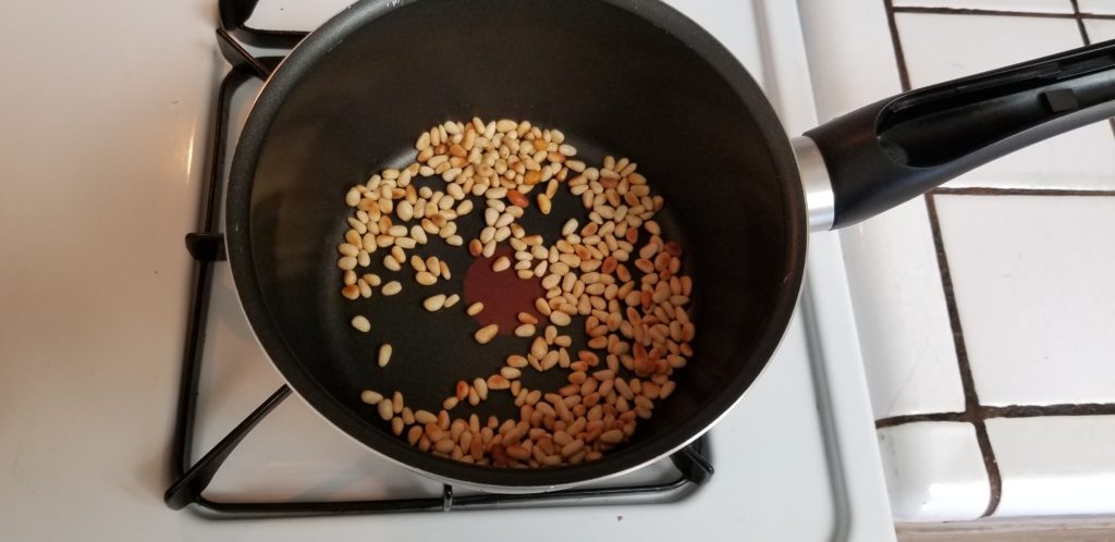Place the pine nuts in a small pan and over medium/high heat give ’em a good toasting for a few minutes.