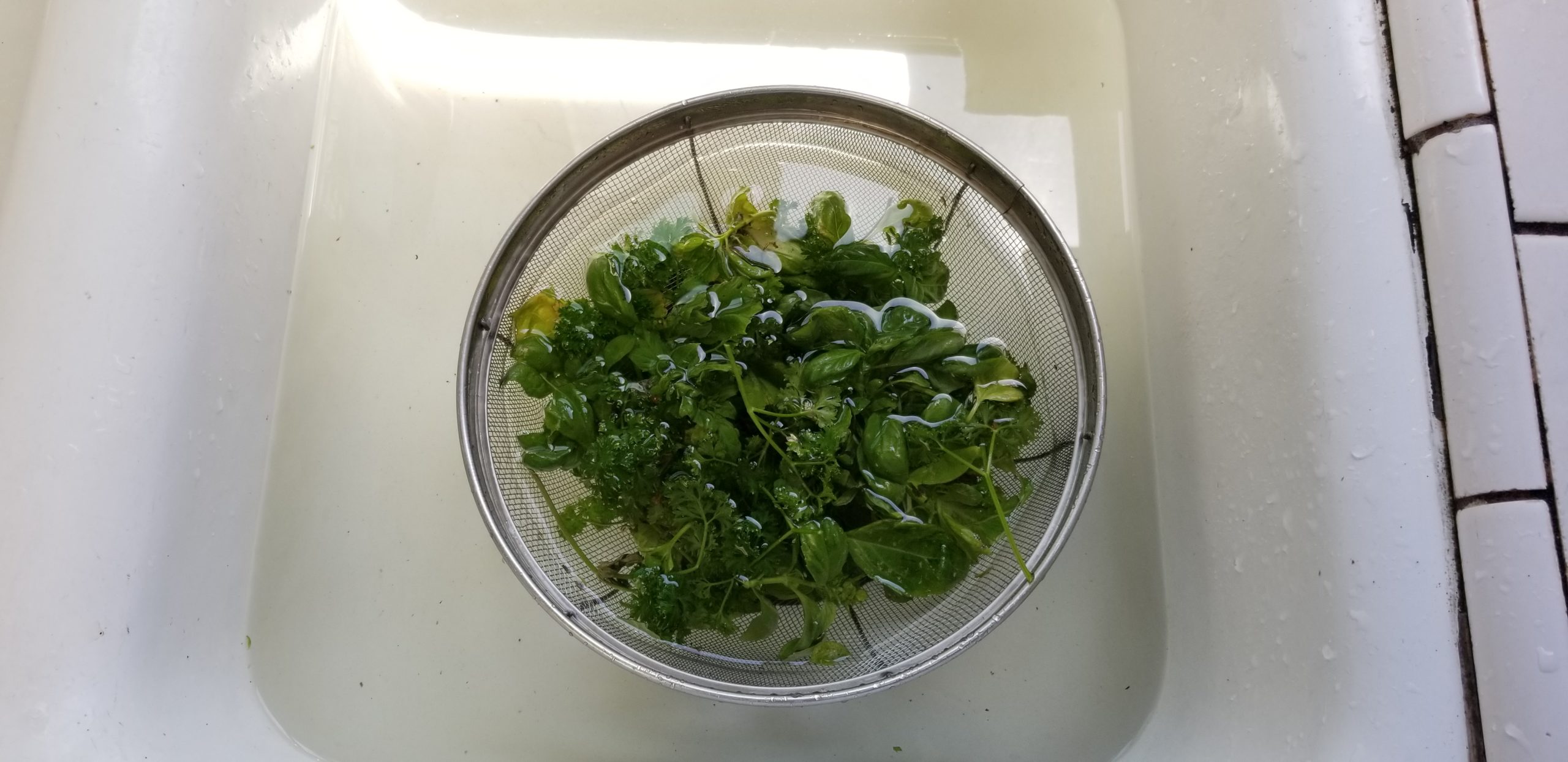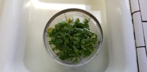 Gather your herbage together and give it a good rinse. Actually I ended up soaking mine in cold water. They’ve been out on the balcony for awhile and I wanted to kill off any wildlife that may be inadvertently interloping.