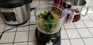 First thing we’re going to do is add the rinsed and dried off herbs along with the toasted pine nuts and give them a few pulses in the food processor. Use a spatula and scrape down the sides of the food processor bowl.