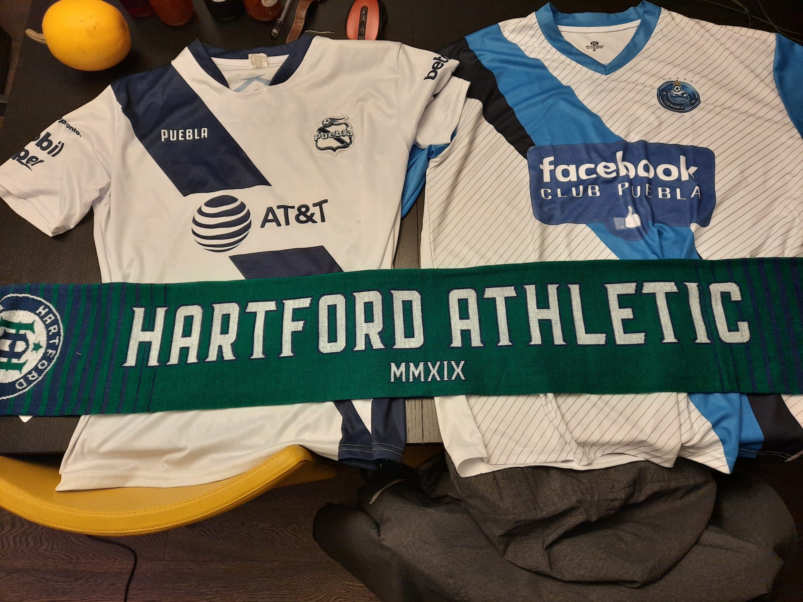 I have a footy scarf collection that is cozying up to 100 but is nae on display due to tiny condo where the Cola’s live. I’m always on the lookout for footy scarves from friends around the world if I can’t get them myself. Arsenal supporter and all around good fellow Horatio Cornblower had shown me a highlight of his local NASL club Hartford Athletic on the twitter. I offhandedly mentioned my scarf addiction to him (No 50 shades) and he was able to get me one and it’s fucking glorious. Beauty coloUrs, very Whalers, which is awesome as I was/am a big fan.