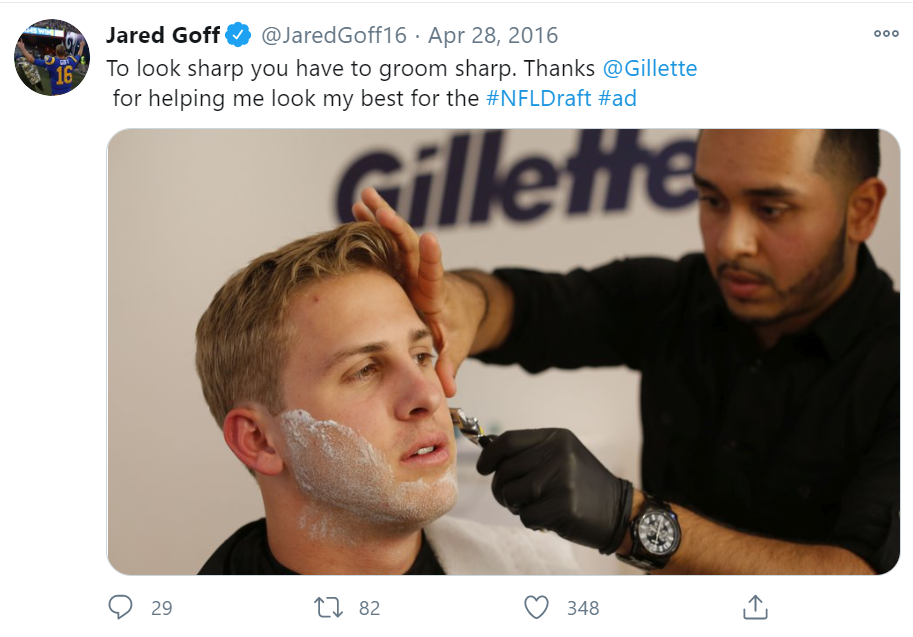 “YEAH! FUCK YEAH!” screamed Goff, forgetting the cameras were on him. It had all been worth it – the lost summers; the late nights; unwashed Berkeley chicks – because now he was going to be a millionaire and play the game that he loved. Plus, he already had the NFL social media touch, expressing a level of brand whoring Adam Schefter could only dream of.