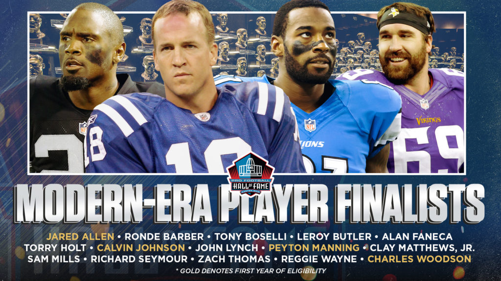 The list of candidates is on the poster. Five of them are eligible for entry; the coaching & contributor categories were separate debates. If you assume Manning & Woodson are locks, that leave three spots for the remaining twelve candidates. Of note: