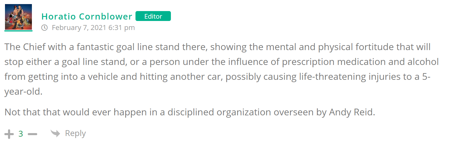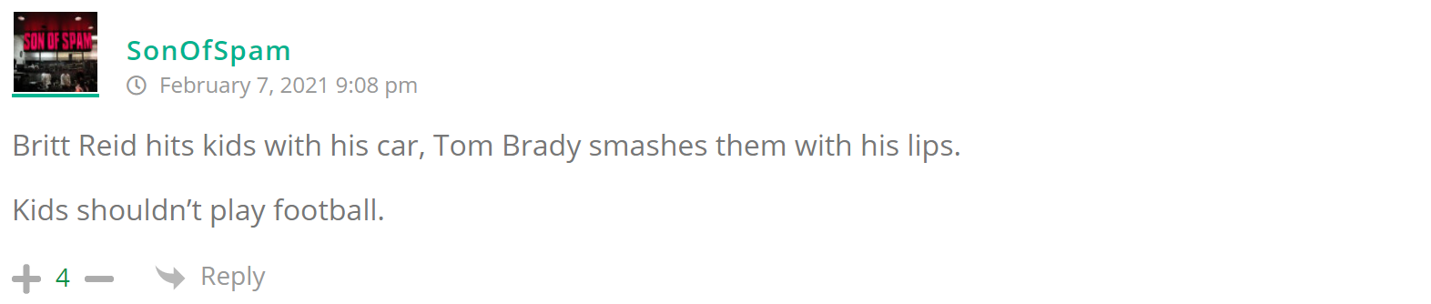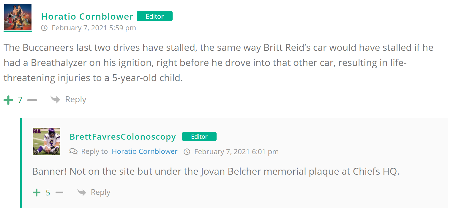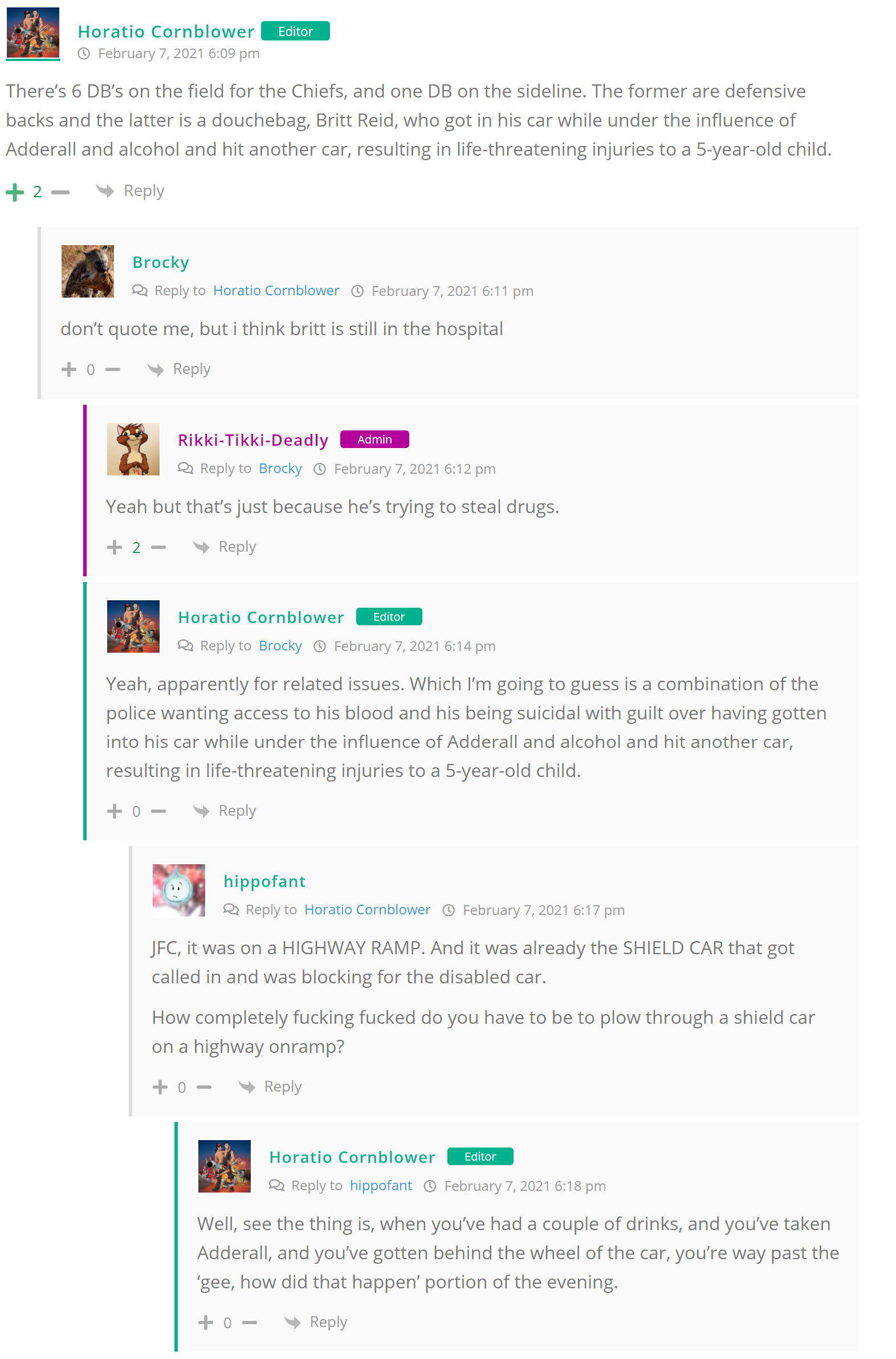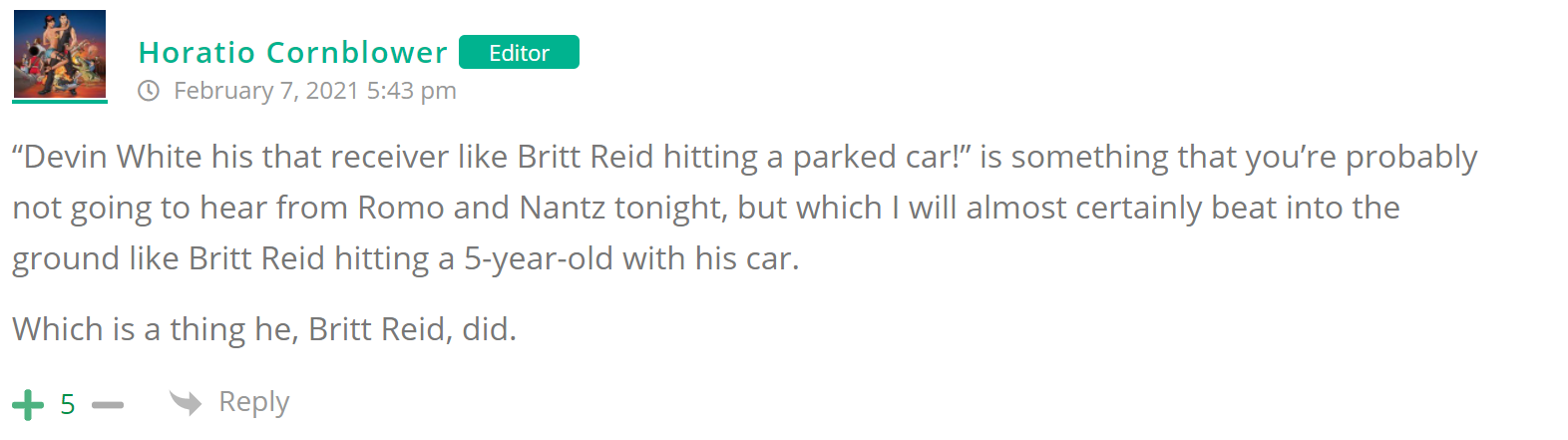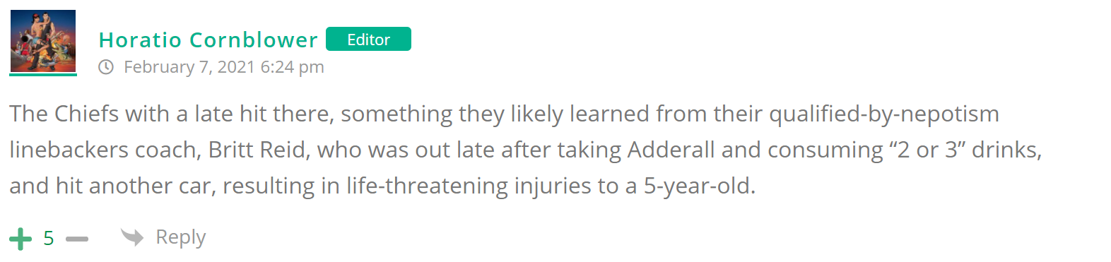 As many of you know, Britt Reid was arrested on suspicion of driving while impaired last Thursday after he collided with two cars that were stopped on a freeway entrance ramp. One of the cars contained two children, ages 4 and 5. The five year-old remains in critical condition after suffering life-threatening injuries. We’re not much for “thoughts and prayers” here at DFO – we mostly just make jokes – so many of the commentists, led by co-MVPs Horatio Cornblower and Mr. Ayo saw fit to remind the world just how much of an irredeemable piece of shit Britt Reid happens to be while the world watched the Tampa Bay Buccaneers absolutely humiliate the Kansas City Chiefs in the Super Bowl.