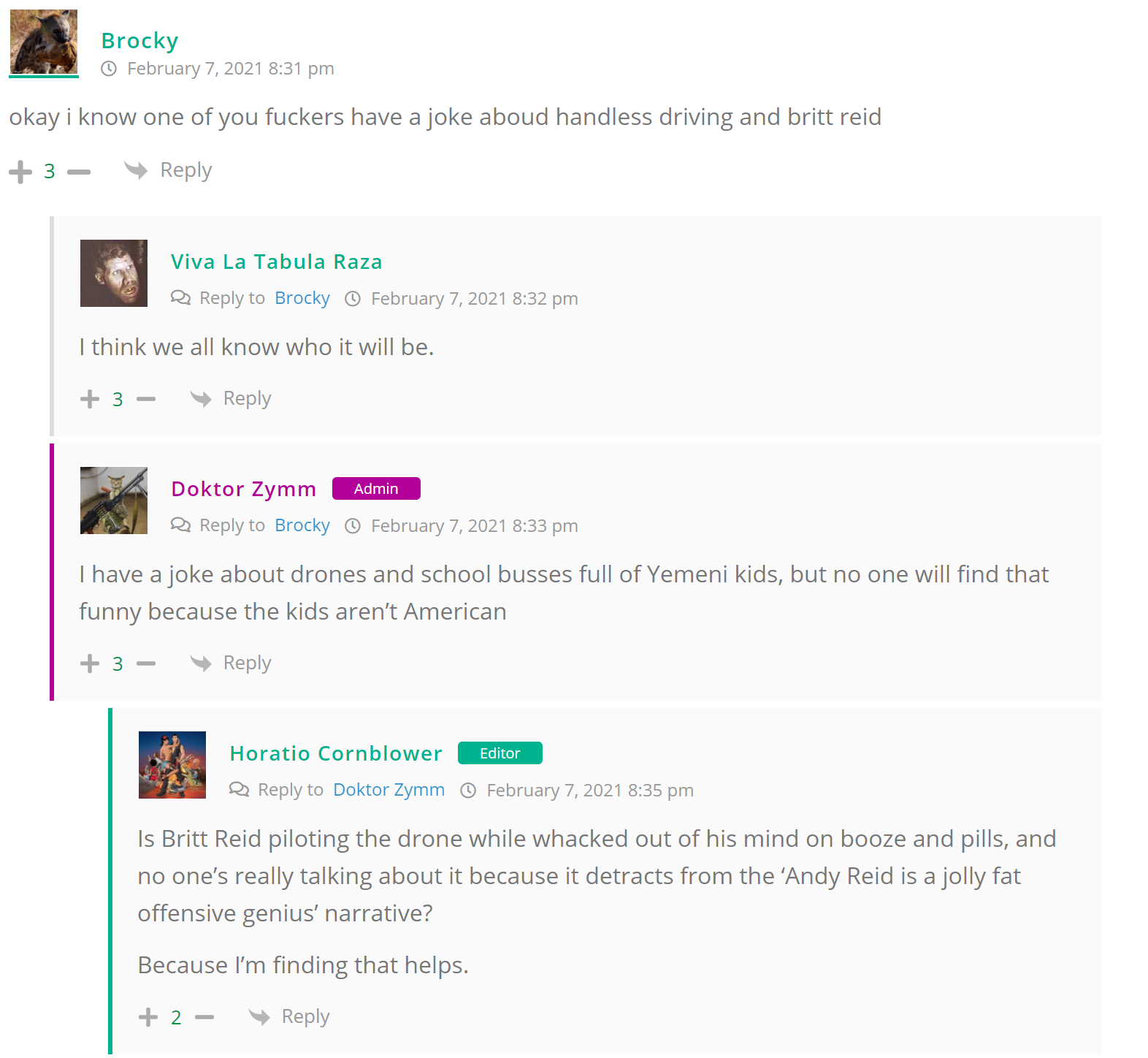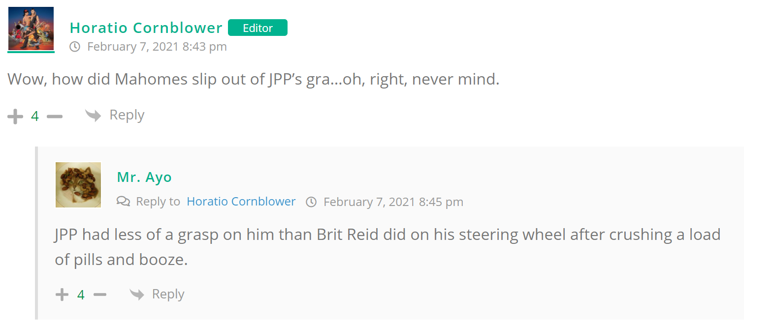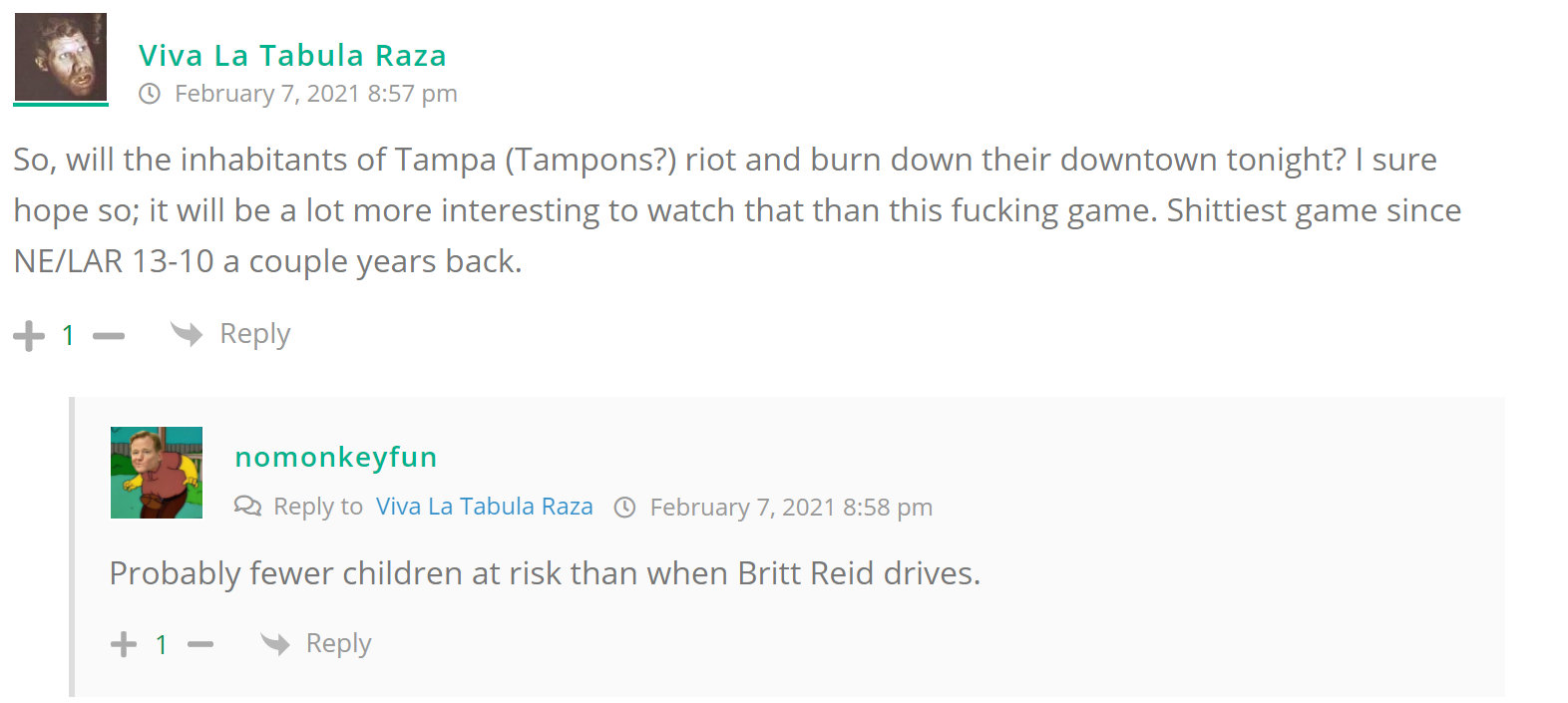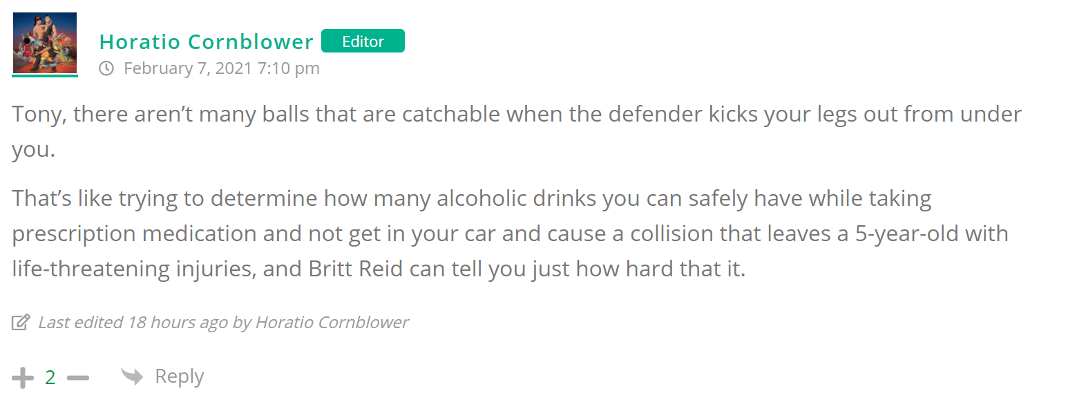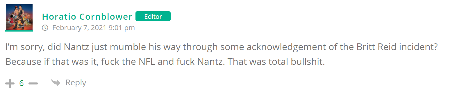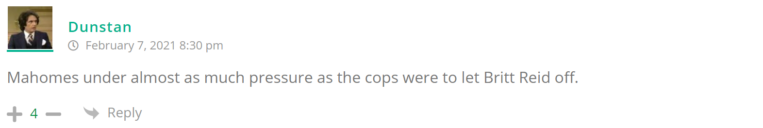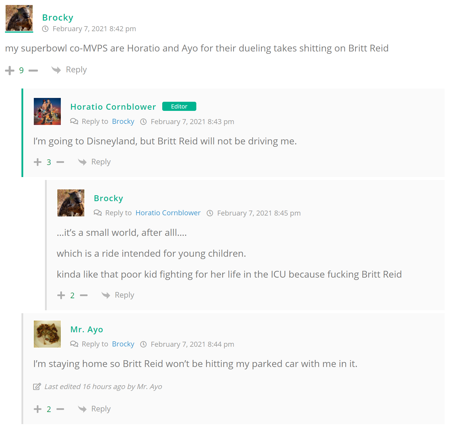 As many of you know, Britt Reid was arrested on suspicion of driving while impaired last Thursday after he collided with two cars that were stopped on a freeway entrance ramp. One of the cars contained two children, ages 4 and 5. The five year-old remains in critical condition after suffering life-threatening injuries. We’re not much for “thoughts and prayers” here at DFO – we mostly just make jokes – so many of the commentists, led by co-MVPs Horatio Cornblower and Mr. Ayo saw fit to remind the world just how much of an irredeemable piece of shit Britt Reid happens to be while the world watched the Tampa Bay Buccaneers absolutely humiliate the Kansas City Chiefs in the Super Bowl.