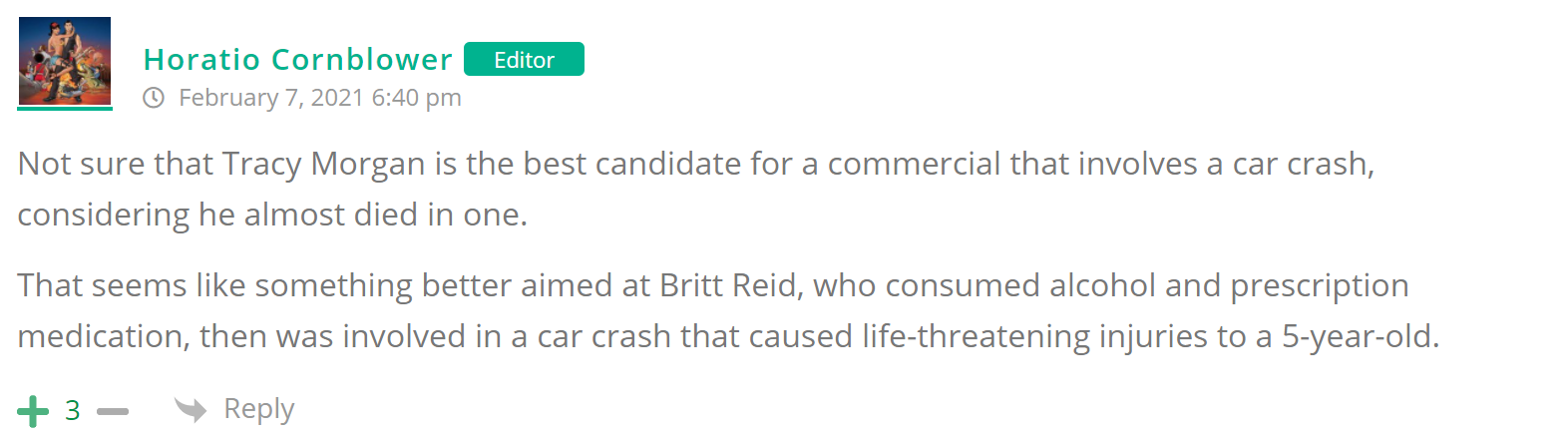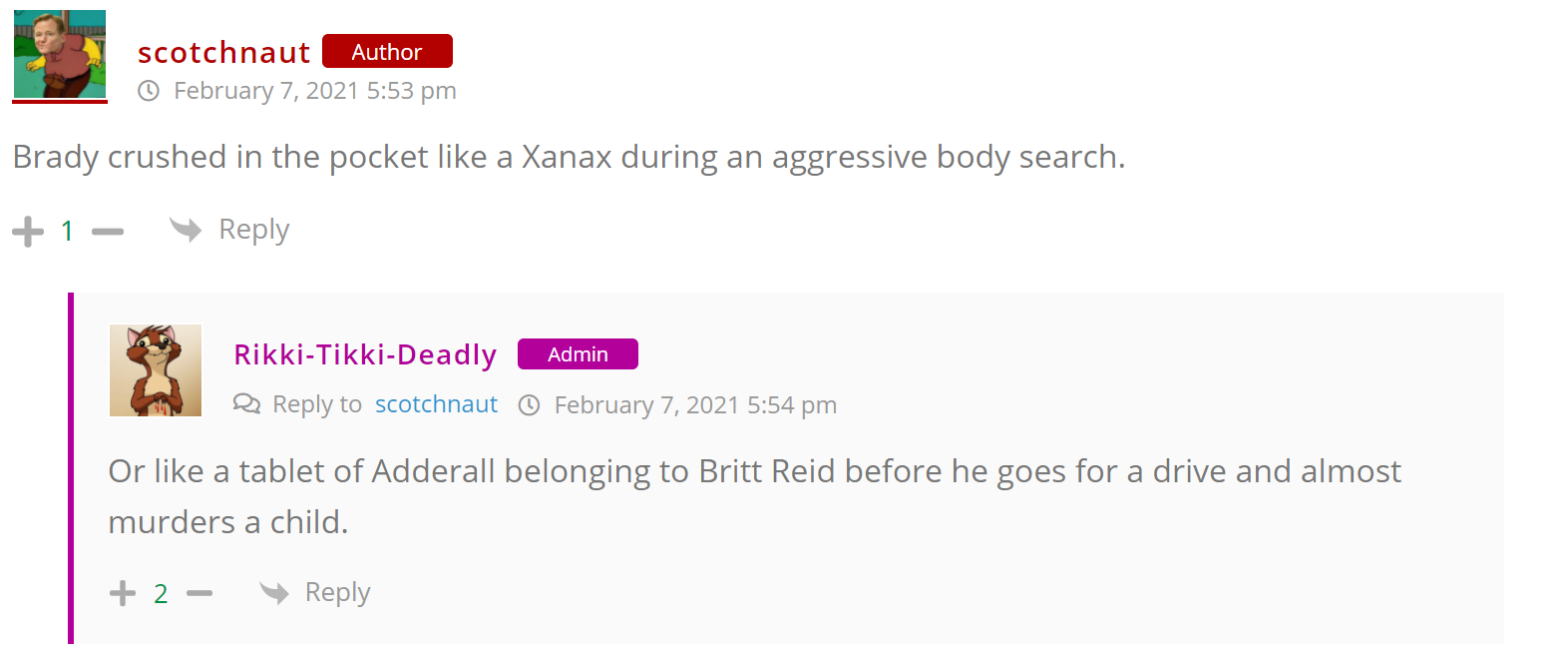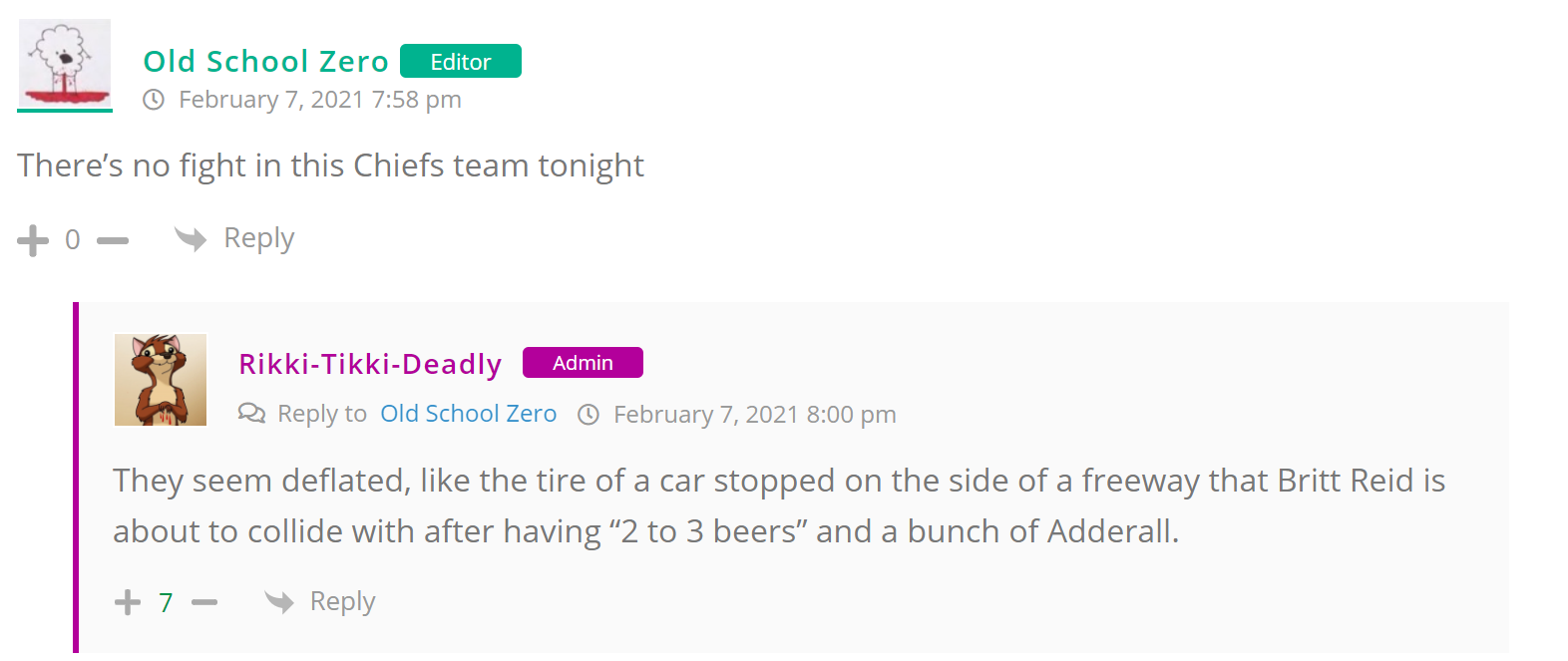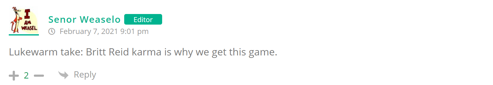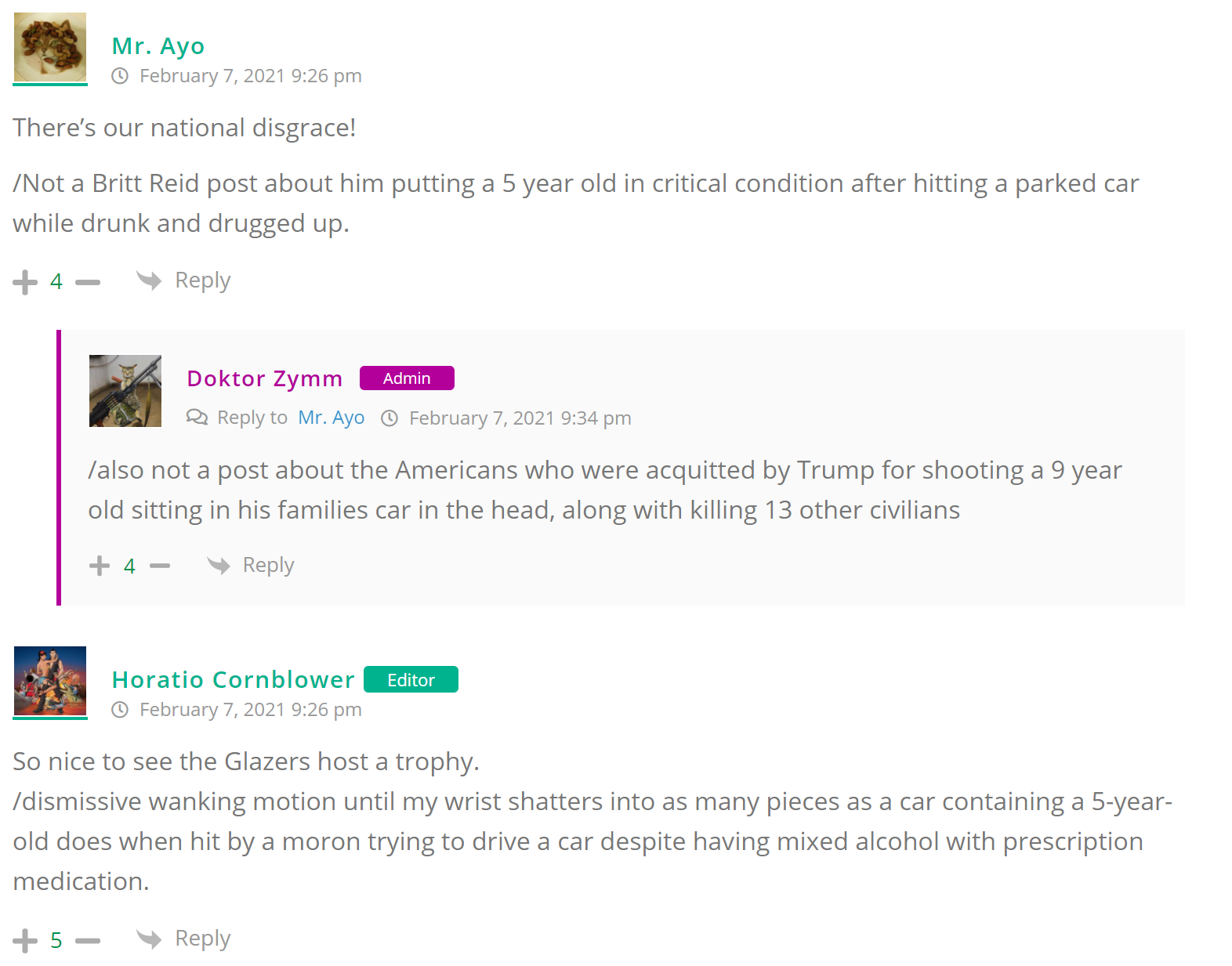 As many of you know, Britt Reid was arrested on suspicion of driving while impaired last Thursday after he collided with two cars that were stopped on a freeway entrance ramp. One of the cars contained two children, ages 4 and 5. The five year-old remains in critical condition after suffering life-threatening injuries. We’re not much for “thoughts and prayers” here at DFO – we mostly just make jokes – so many of the commentists, led by co-MVPs Horatio Cornblower and Mr. Ayo saw fit to remind the world just how much of an irredeemable piece of shit Britt Reid happens to be while the world watched the Tampa Bay Buccaneers absolutely humiliate the Kansas City Chiefs in the Super Bowl.