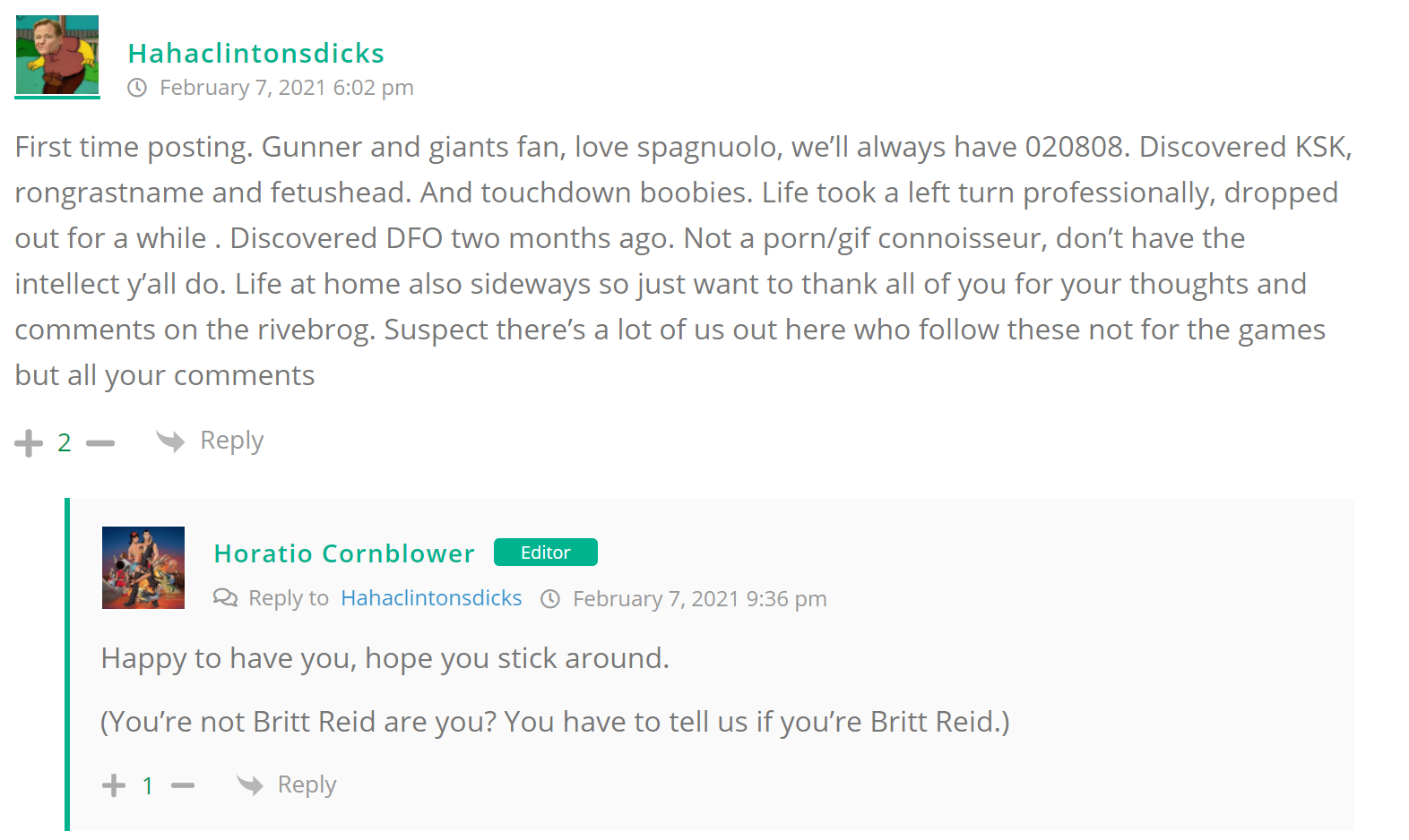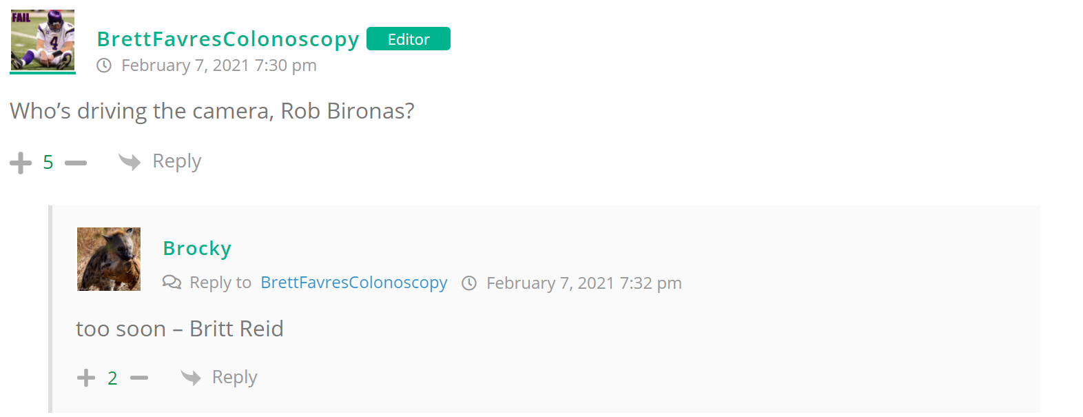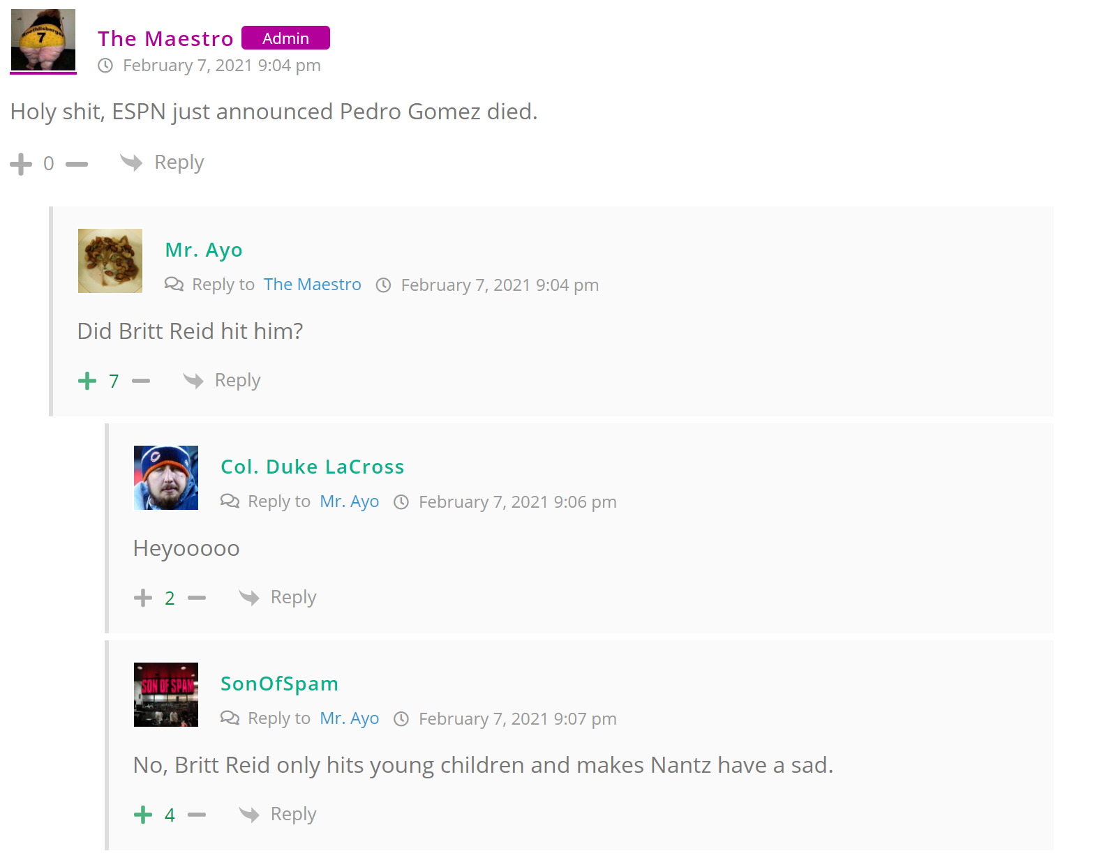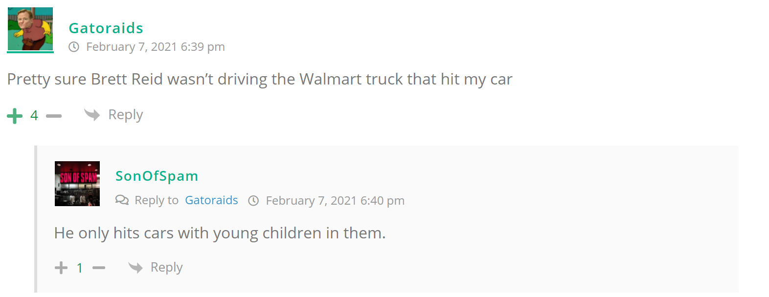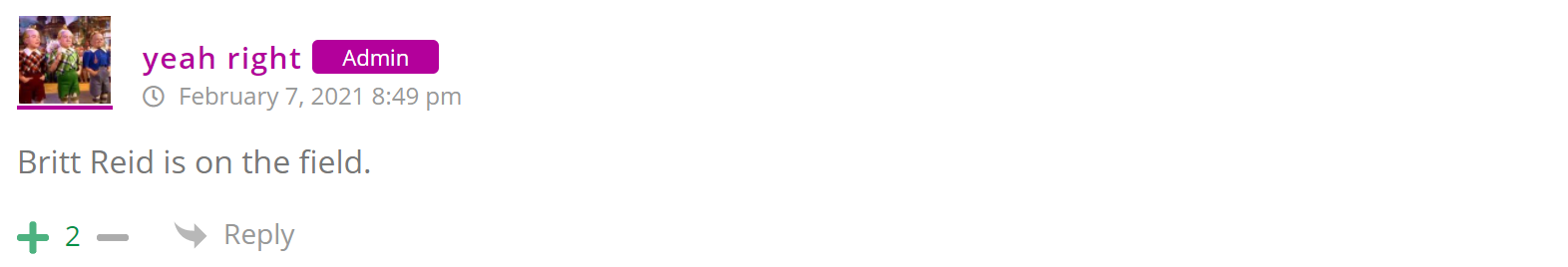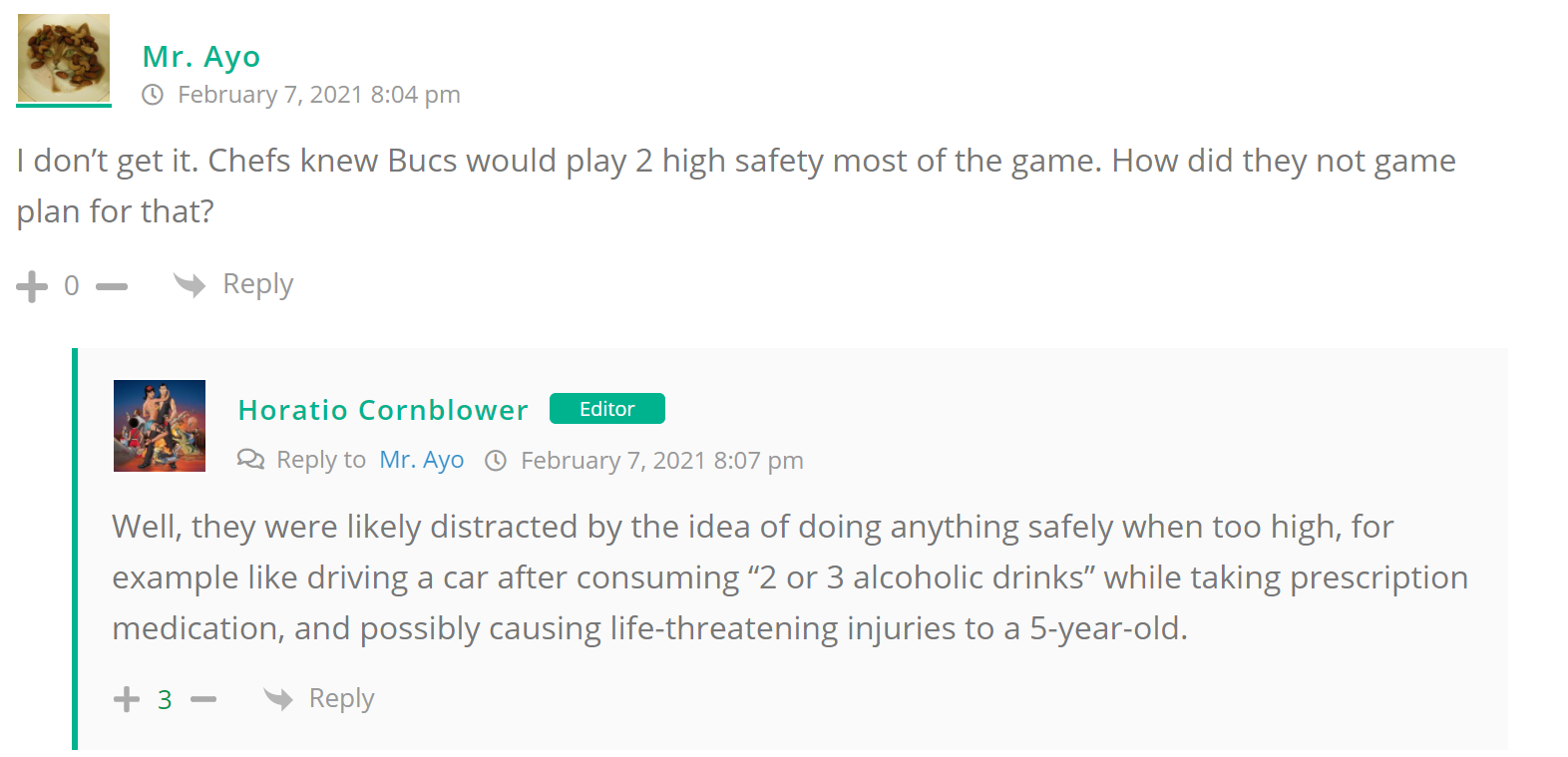 As many of you know, Britt Reid was arrested on suspicion of driving while impaired last Thursday after he collided with two cars that were stopped on a freeway entrance ramp. One of the cars contained two children, ages 4 and 5. The five year-old remains in critical condition after suffering life-threatening injuries. We’re not much for “thoughts and prayers” here at DFO – we mostly just make jokes – so many of the commentists, led by co-MVPs Horatio Cornblower and Mr. Ayo saw fit to remind the world just how much of an irredeemable piece of shit Britt Reid happens to be while the world watched the Tampa Bay Buccaneers absolutely humiliate the Kansas City Chiefs in the Super Bowl.