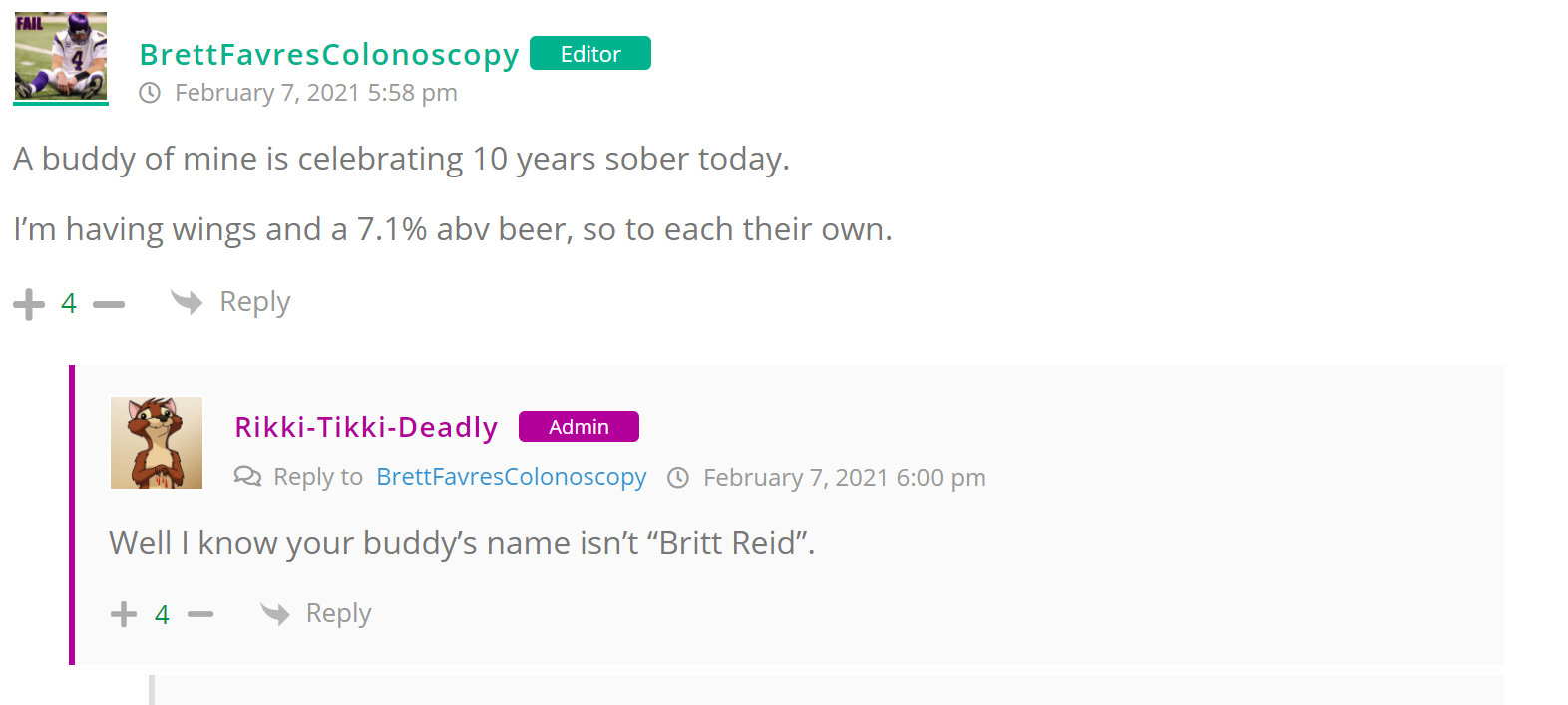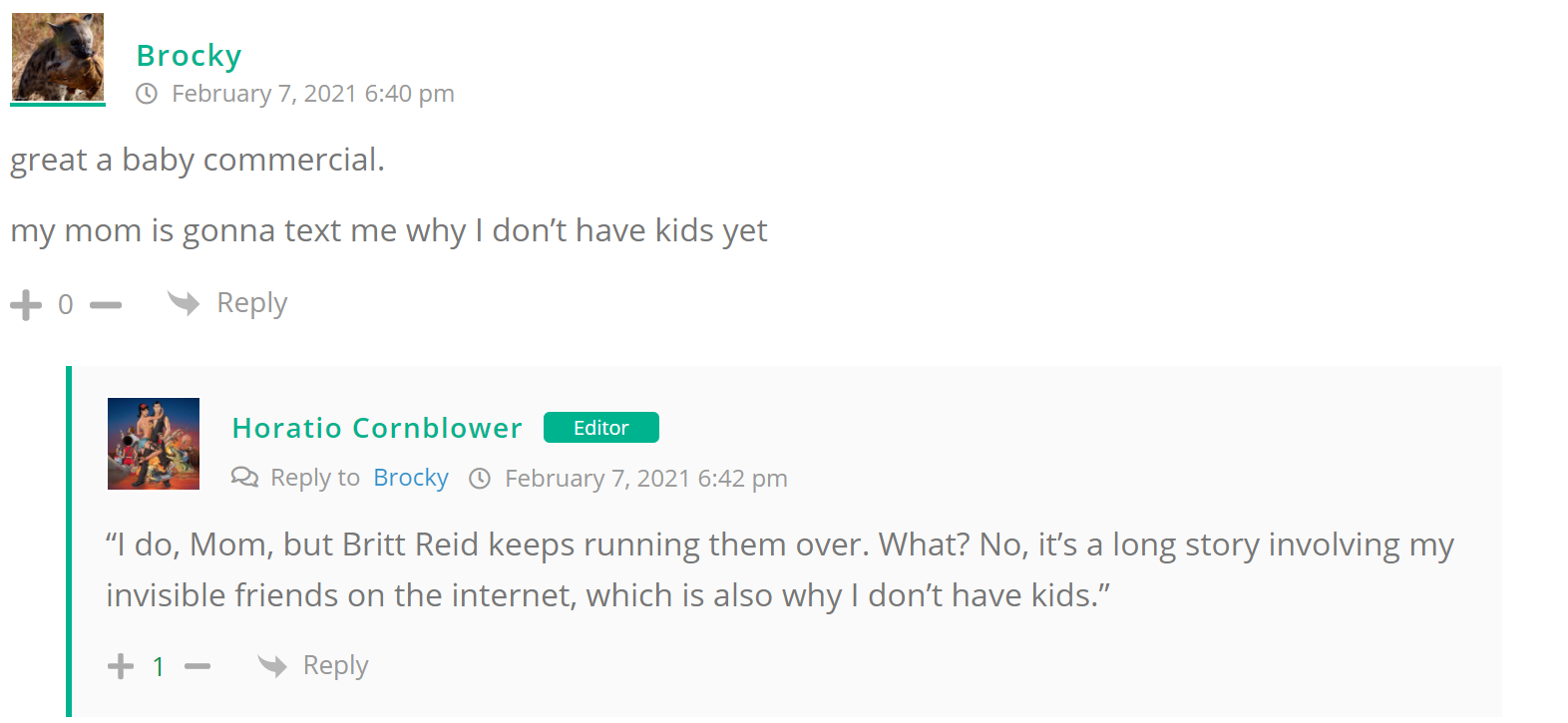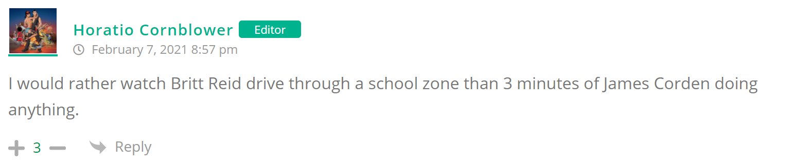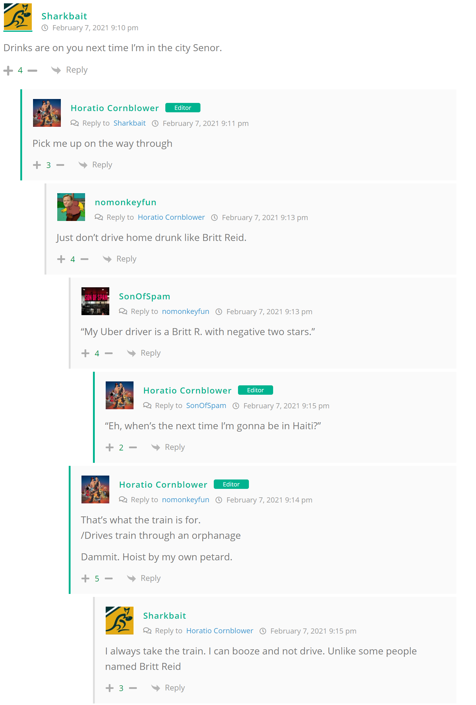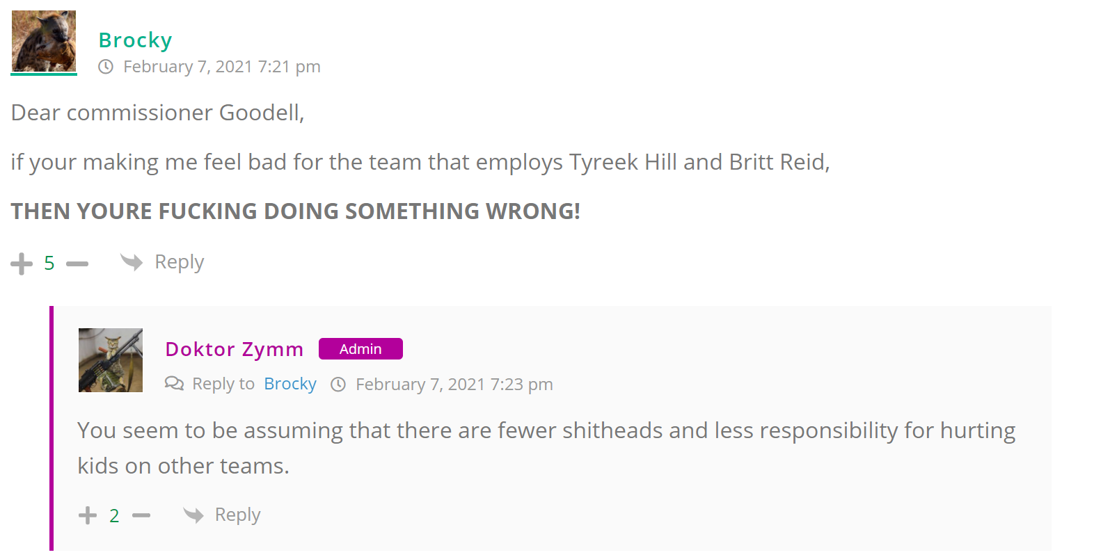 As many of you know, Britt Reid was arrested on suspicion of driving while impaired last Thursday after he collided with two cars that were stopped on a freeway entrance ramp. One of the cars contained two children, ages 4 and 5. The five year-old remains in critical condition after suffering life-threatening injuries. We’re not much for “thoughts and prayers” here at DFO – we mostly just make jokes – so many of the commentists, led by co-MVPs Horatio Cornblower and Mr. Ayo saw fit to remind the world just how much of an irredeemable piece of shit Britt Reid happens to be while the world watched the Tampa Bay Buccaneers absolutely humiliate the Kansas City Chiefs in the Super Bowl.