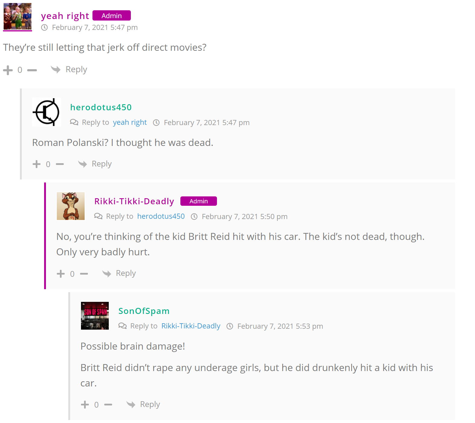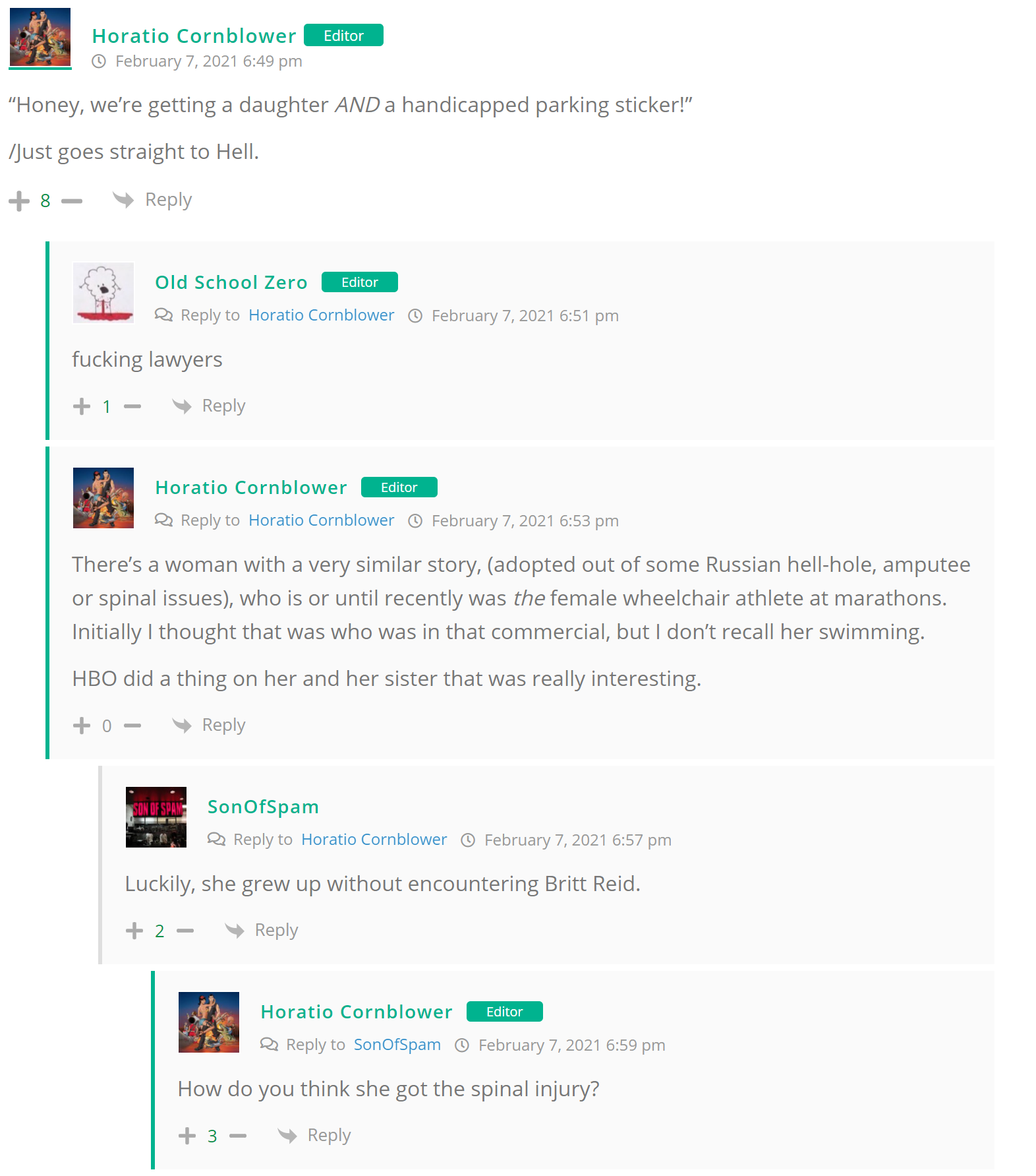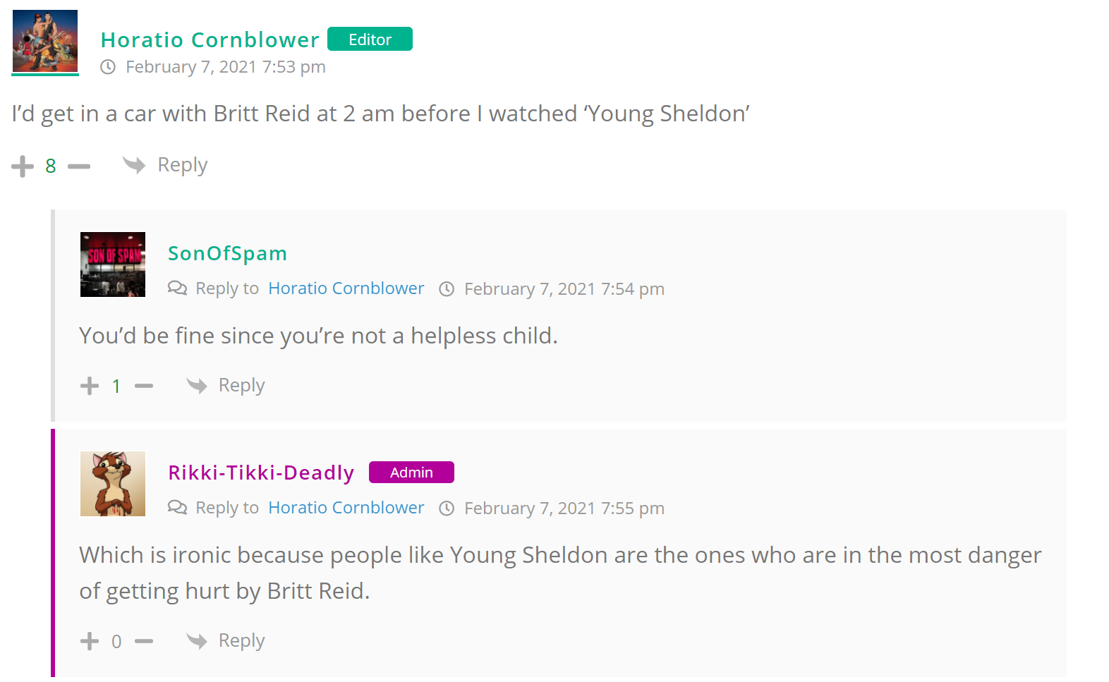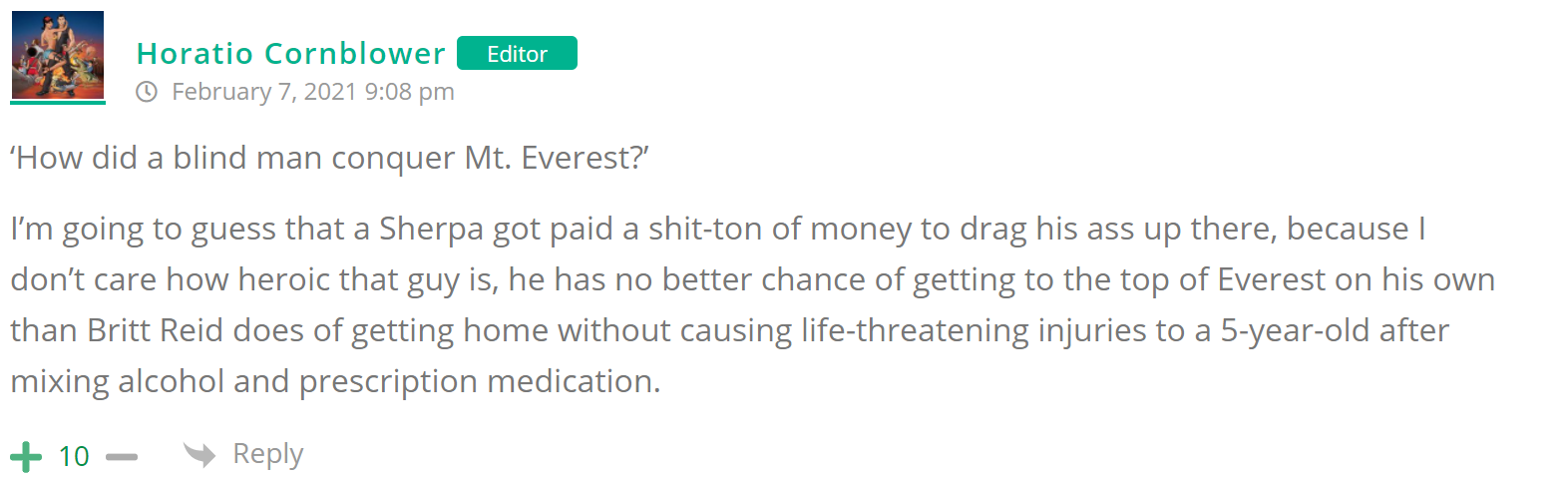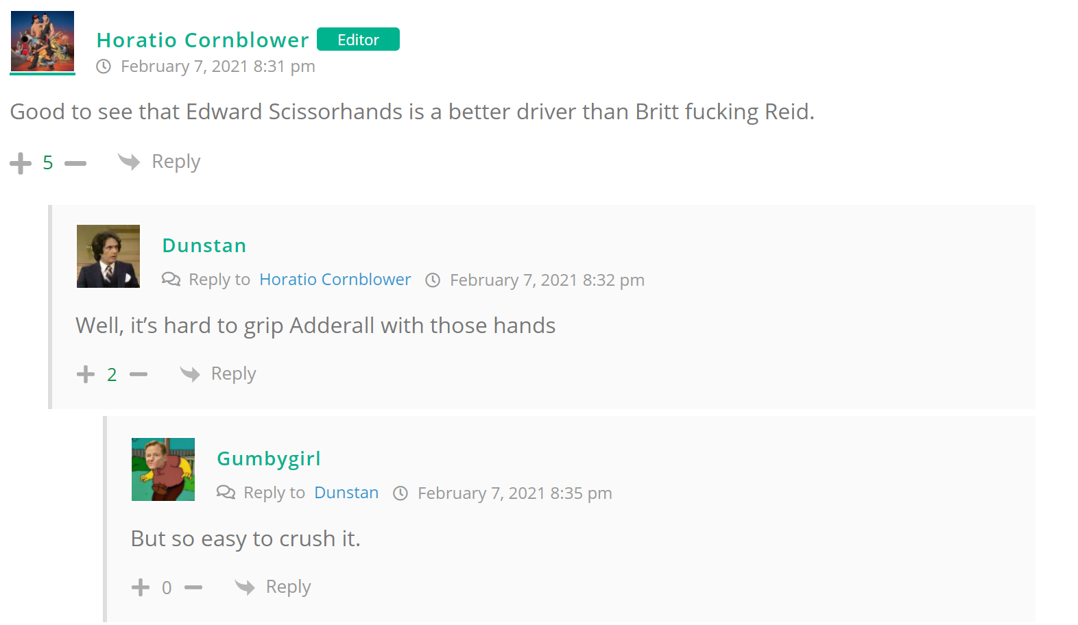 As many of you know, Britt Reid was arrested on suspicion of driving while impaired last Thursday after he collided with two cars that were stopped on a freeway entrance ramp. One of the cars contained two children, ages 4 and 5. The five year-old remains in critical condition after suffering life-threatening injuries. We’re not much for “thoughts and prayers” here at DFO – we mostly just make jokes – so many of the commentists, led by co-MVPs Horatio Cornblower and Mr. Ayo saw fit to remind the world just how much of an irredeemable piece of shit Britt Reid happens to be while the world watched the Tampa Bay Buccaneers absolutely humiliate the Kansas City Chiefs in the Super Bowl.