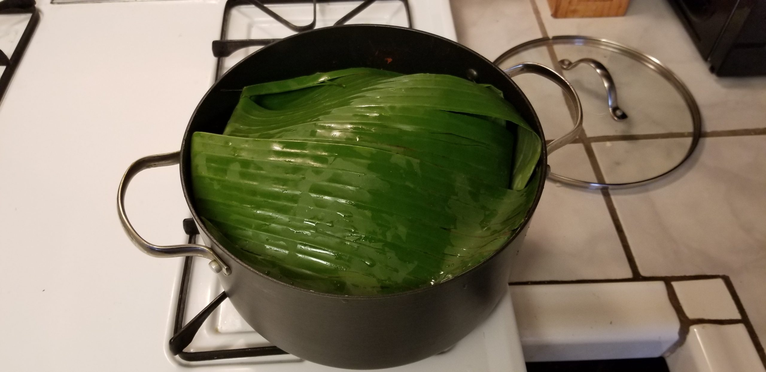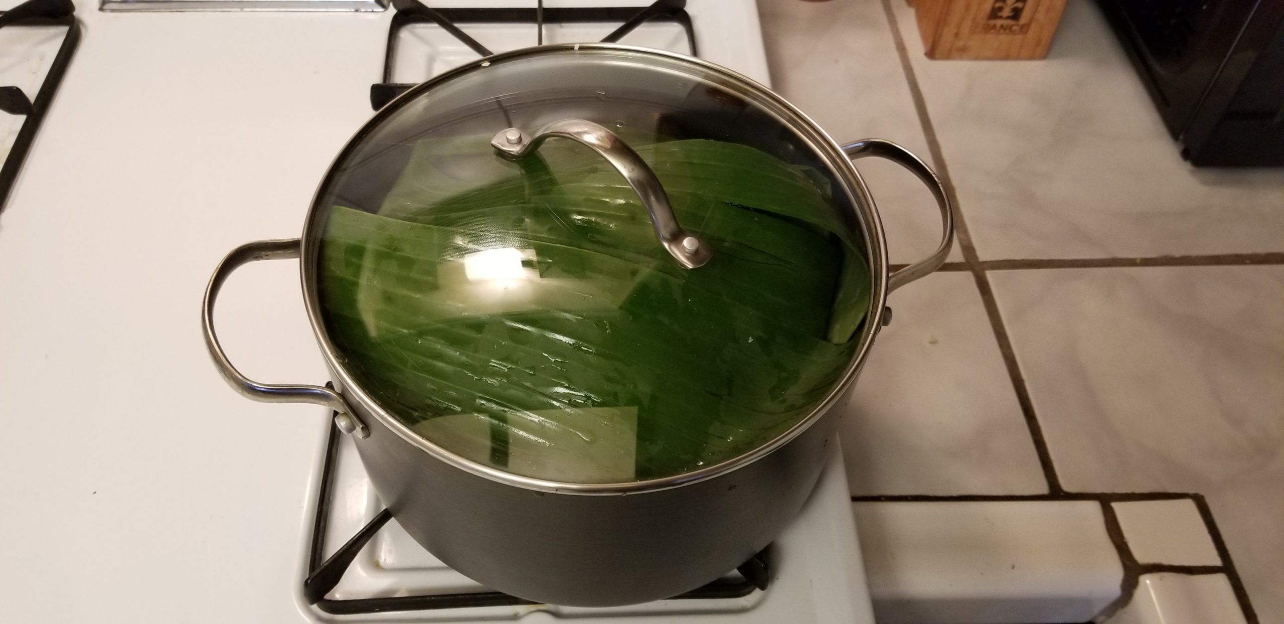 Line the bottom of a Dutch oven with a layer of banana leaves