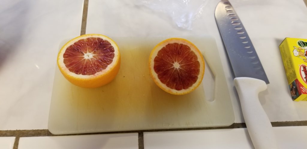 Blood oranges! We need a cup of orange juice. Two oranges wasn’t quite enough so I added enough regular orange juice to make a cup.