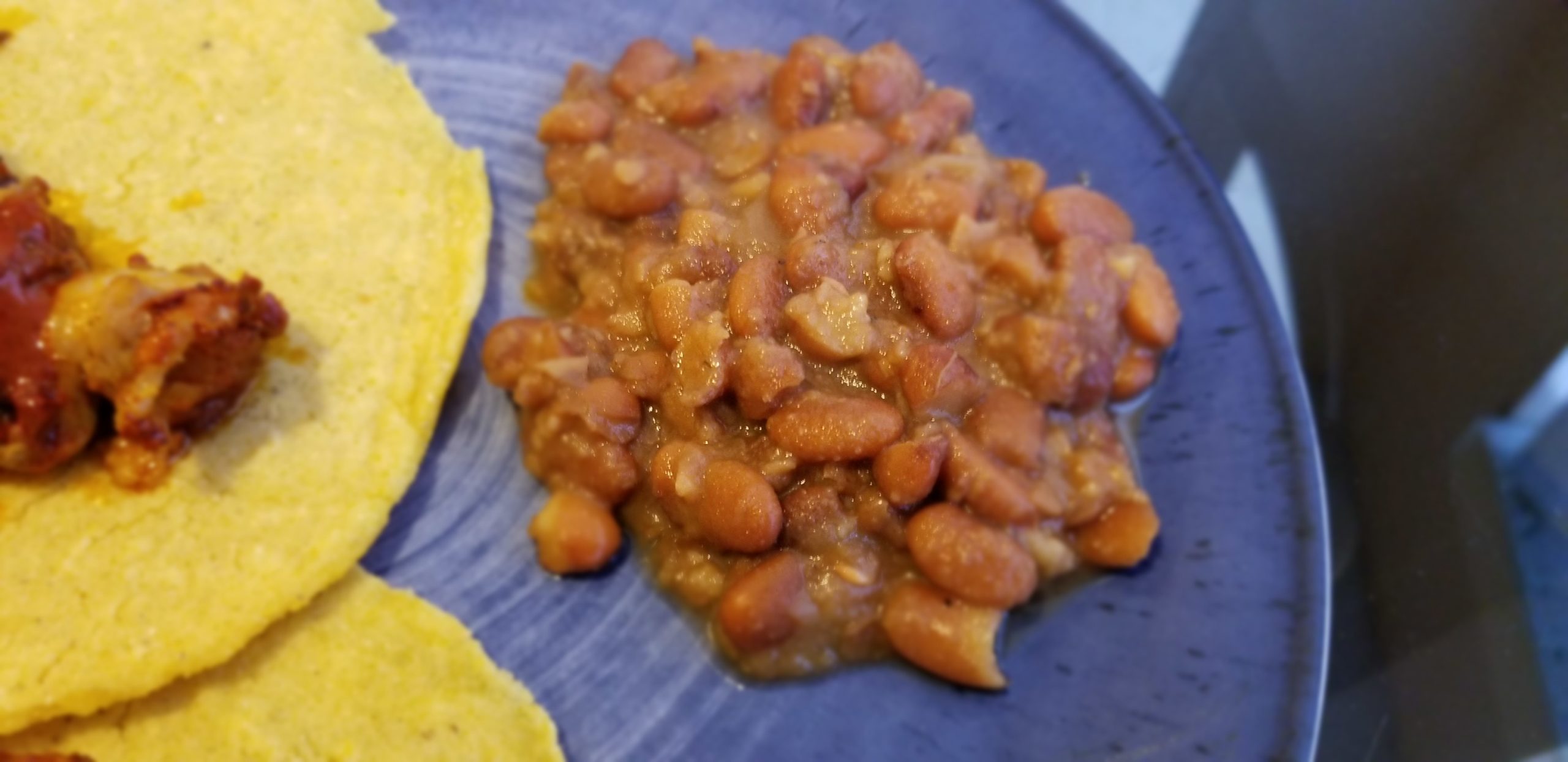The traditional pinto beans, sorted and rinsed, some minced onion and garlic, salt, pepper, cumin, chile powder, chile de arbol, cover with water then low simmer for 2 1/2 hours. Right at the end of cooking add in some bacon grease and you are there.