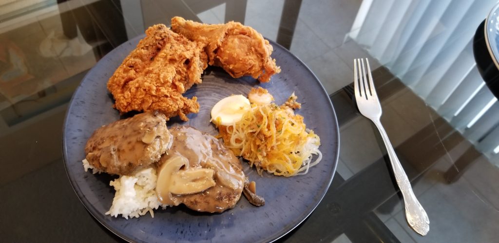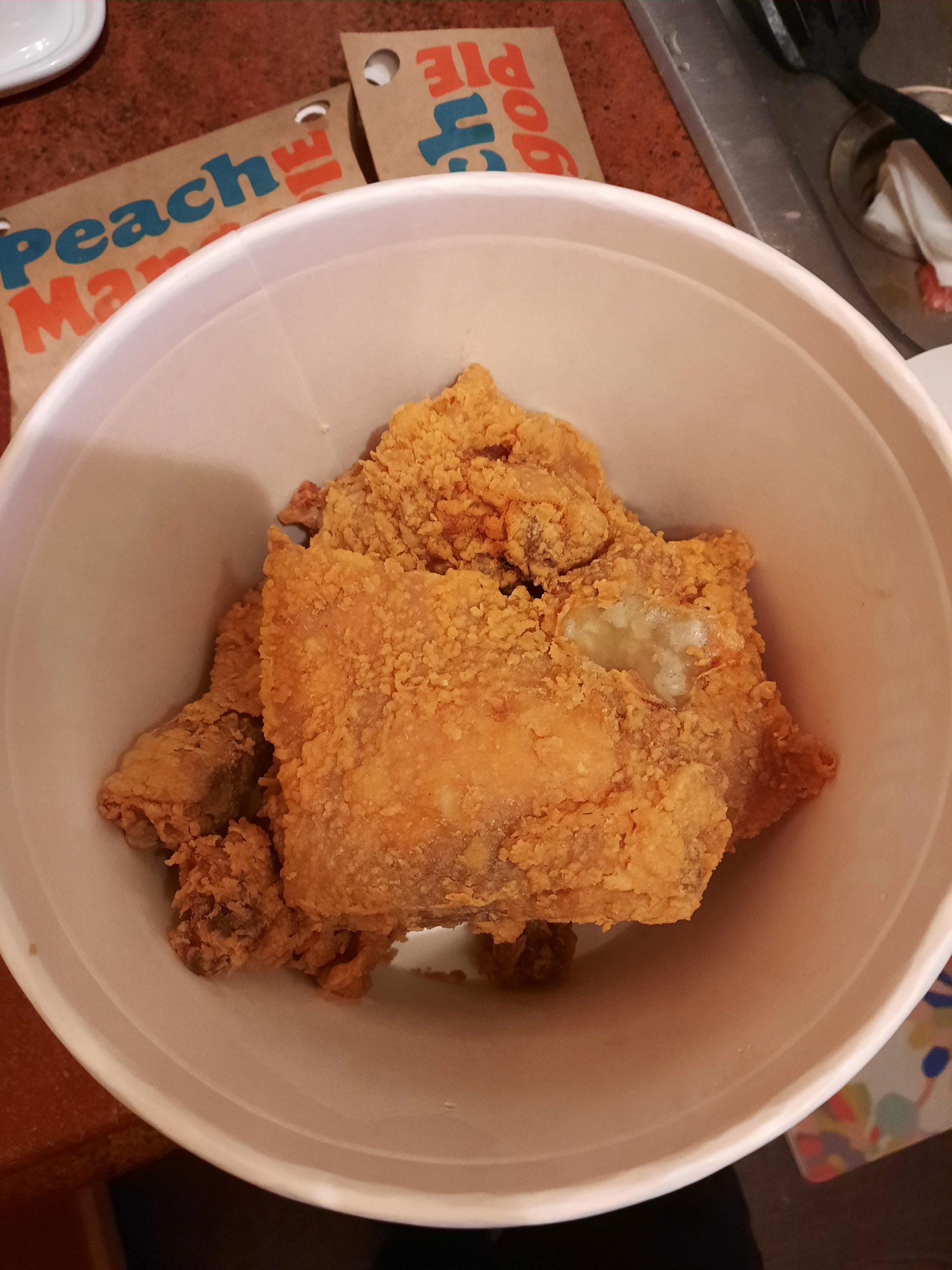I ordered the Bucket Treat A which included 6 pieces of chicken, 6 “Burgersteaks” and 3 peach mango pies. I also ordered the “Palabok Fiesta” with palabok being a very similar type of noodle dish to Pancit. Of which I’ve partaken roughly 75 times in my life. Pancit fucking rules. And finally I ordered a side of steamed rice. Since I noticed a distinct lack of starch from the Bucket Joy A.