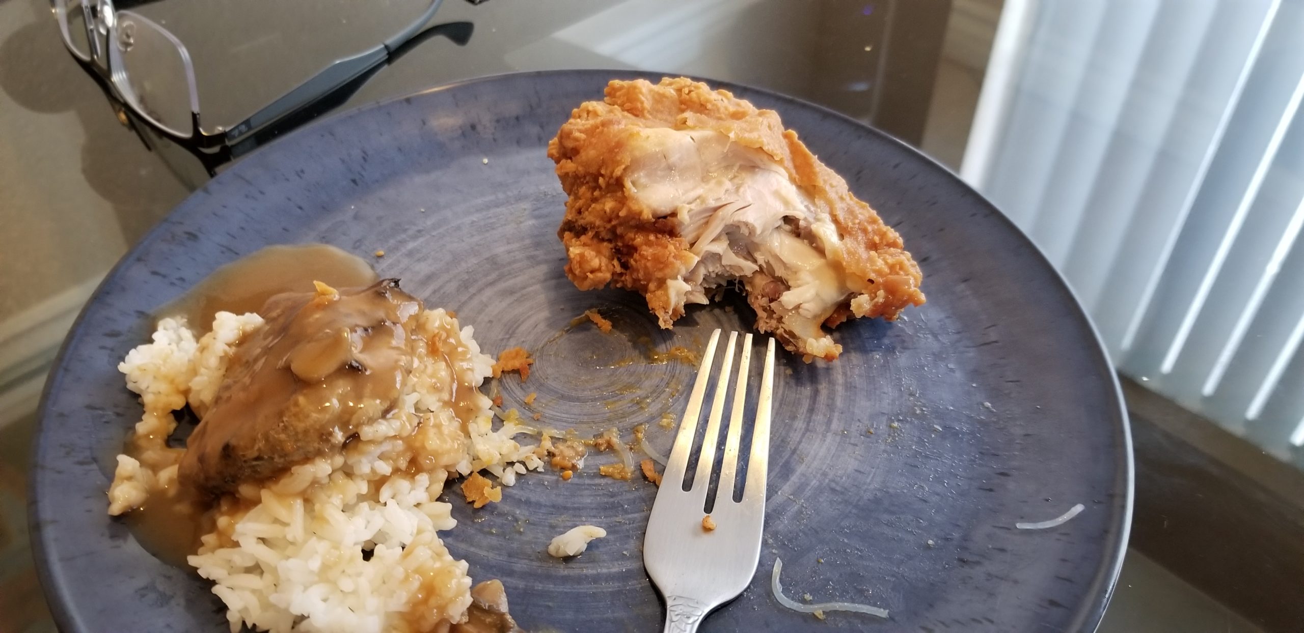Oh yeah, this is good. The smell definitely matches the taste. It is not overly oily and quite crispy which is what I look for in my fried chicken. There are a lot of hipster chicken joints here and in a blind chicken tasting (that is an idea) I think it would stand up to far more expensive brands. The gravy is fairly light not peppery which Mrs. Cola likes and pairs well with the crispy chicken. I am getting more impressed by the minute as I am really looking forward to trying it cold. That is where a true fried chicken earns its points.