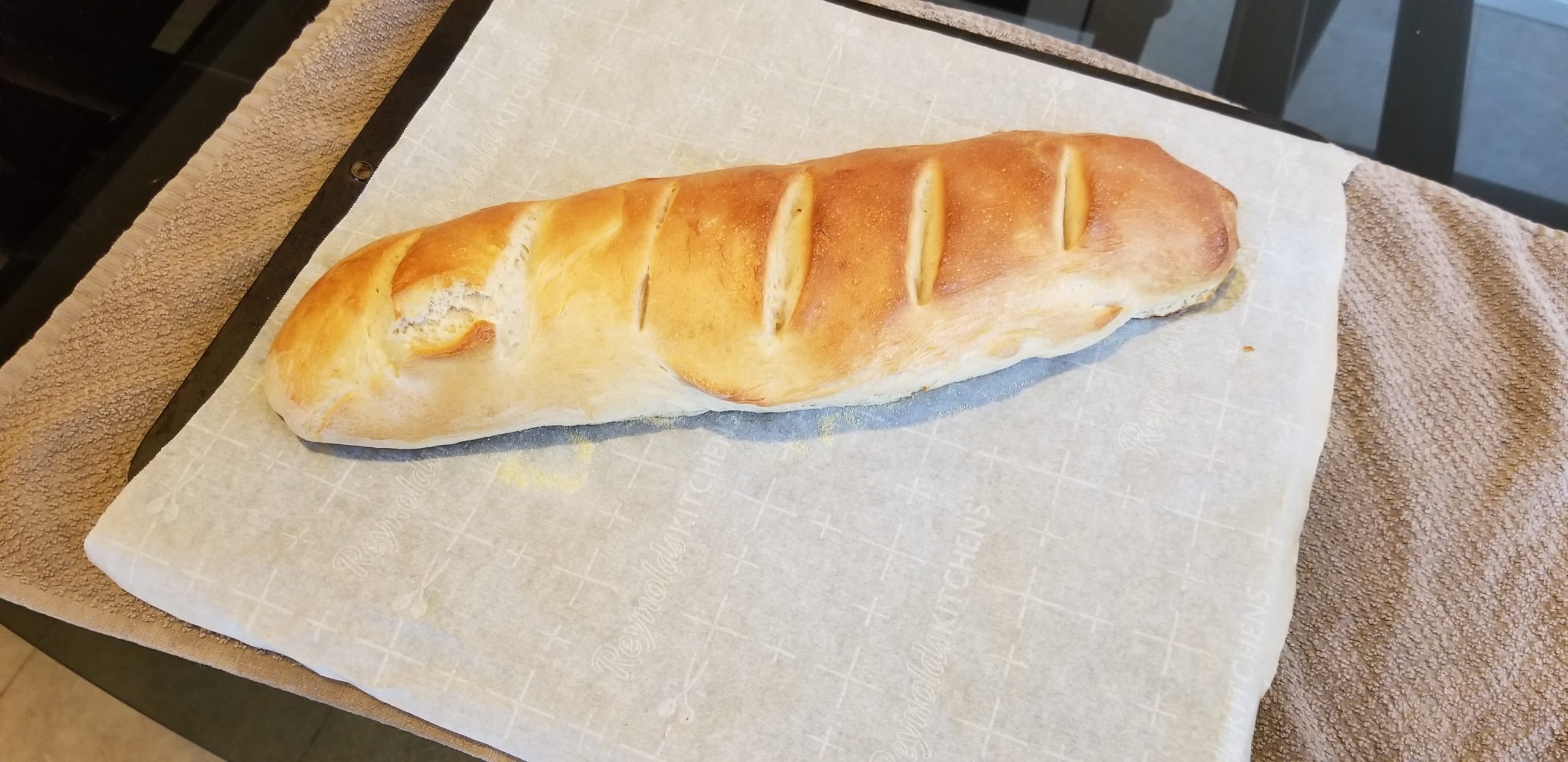 What did we do different today in order to improve crustiness? We started the bread in a pre-heated 400 degree oven rather than the standard 350, bake for 5 minutes, then spritz the bread with some water. Standard spray bottle is perfect here.