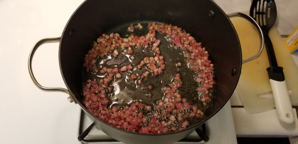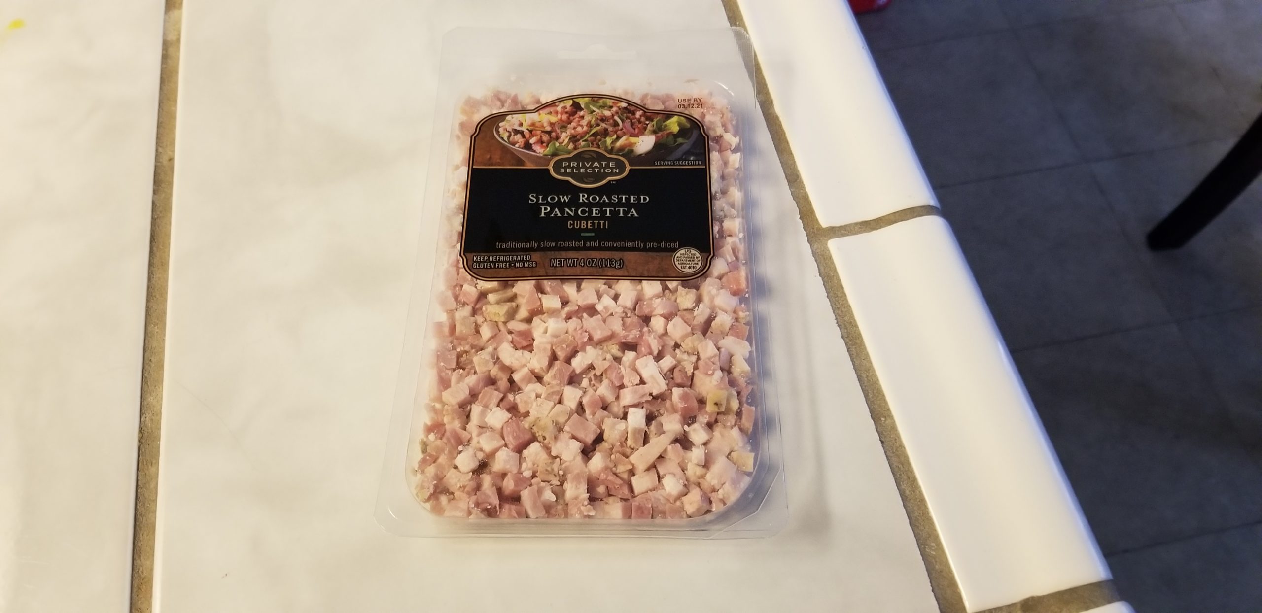 Grab our pancetta, my local Ralph’s has theirs already diced which is pretty goddamn convenient as far as I’m concerned.