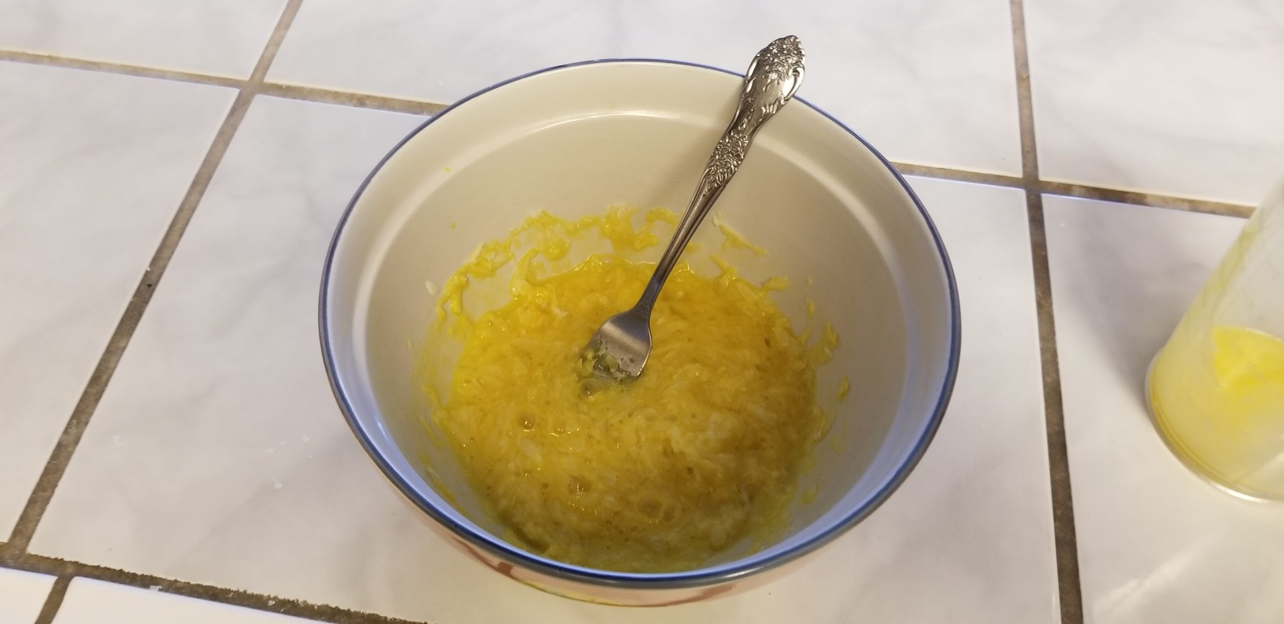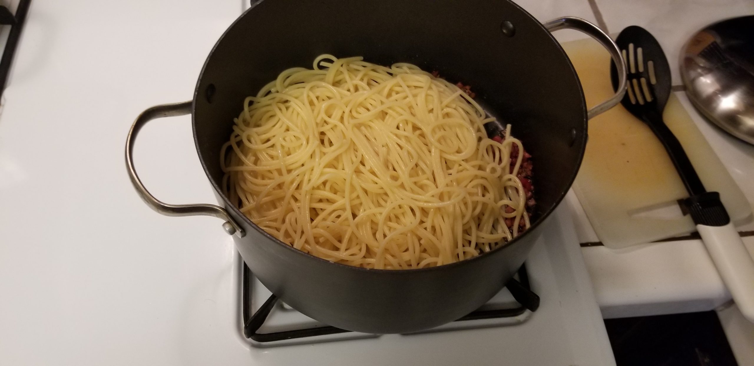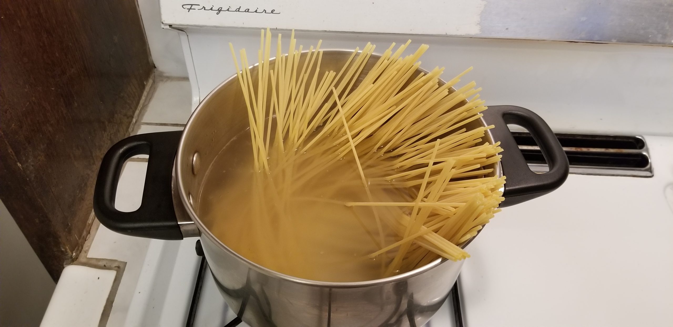 Again, I used the store bought spaghetti for its starch component. I used “spaghetti” specifically because it’s a denser pasta. When the pasta is al dente scoop out a cup of the pasta water and set aside.