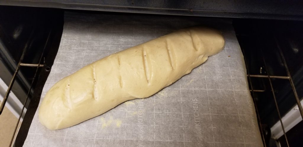 This is on its final rise after we’ve shaped and slashed. Once the final rise is finished, give it a baste with the egg wash and get that bastard into the oven.