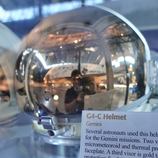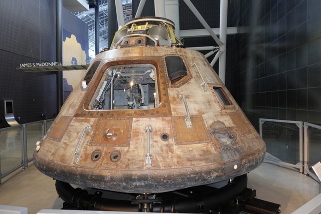 Here’s an Apollo command module sitting on a roller stand, on the main floor of the Smithsonian Air & Space Museum’s Udvar-Hazy Annex at Dulles Airport. There’s just a little fence around it, and I could have touched it.