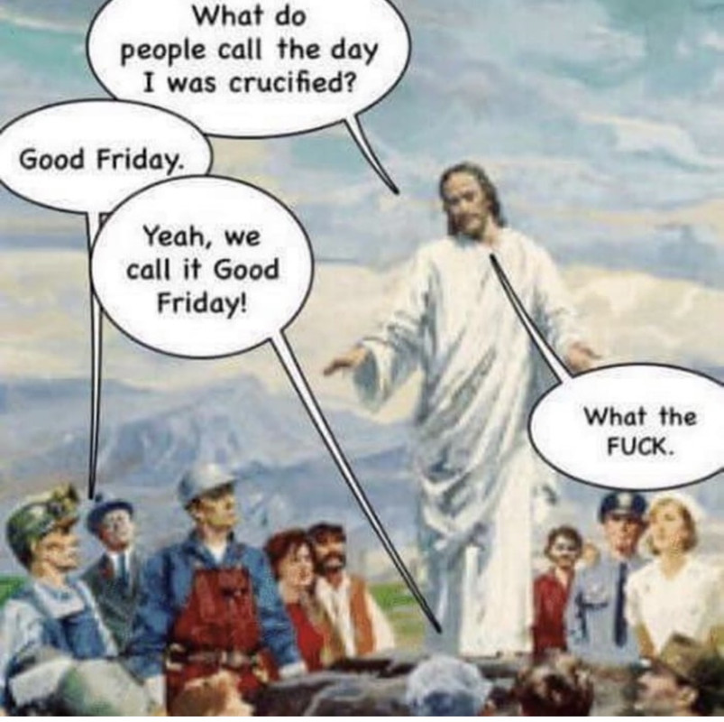 Jesus: So this is the day I was nailed to a cross and murdered. We should have a name for it. Terrible Friday or something like that