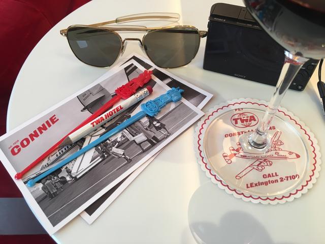 The bottom picture is a table in the Constellation. I was sitting in the vintage 1950s airline seat and it was still more comfortable than today’s first-class recliner offerings. I stayed at the TWA the day before its grand opening; everything was available and it was pristine.