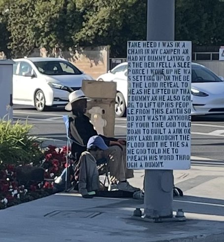 I don’t know if this guy is a homeless ventriloquist, a religious nutcase, or a very committed performance artist.
