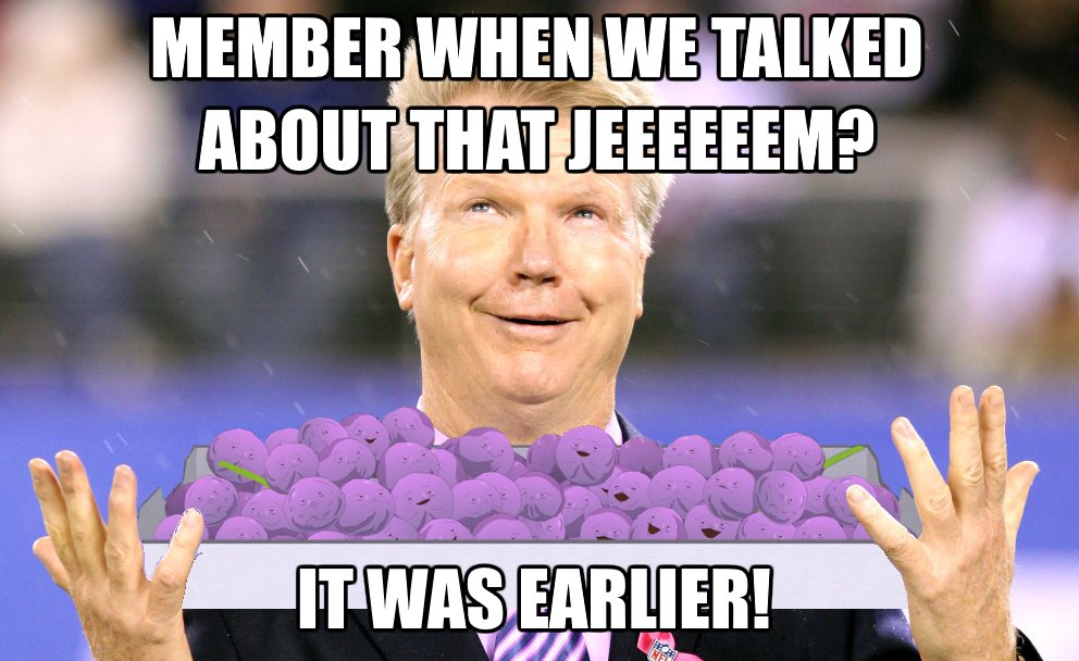 I was watching the first half of UF/FSU last night. Total offensive explosion; the O/U was 80.5. After a long run, the color analyst says, “I can remember when we talked about a hundred yard game [for a running back] as a big game. Now, these guys rack up a hundred yards in a quarter and a half!” And the play-by-play guy immediately follows that comment with, “It was Tony Soprano who said, ‘Remember when’ is the lowest form of conversation”, and then called the next play. Who knows why he said it? But it was followed by the most uncomfortable fucking silence imaginable. Did anyone else hear that?