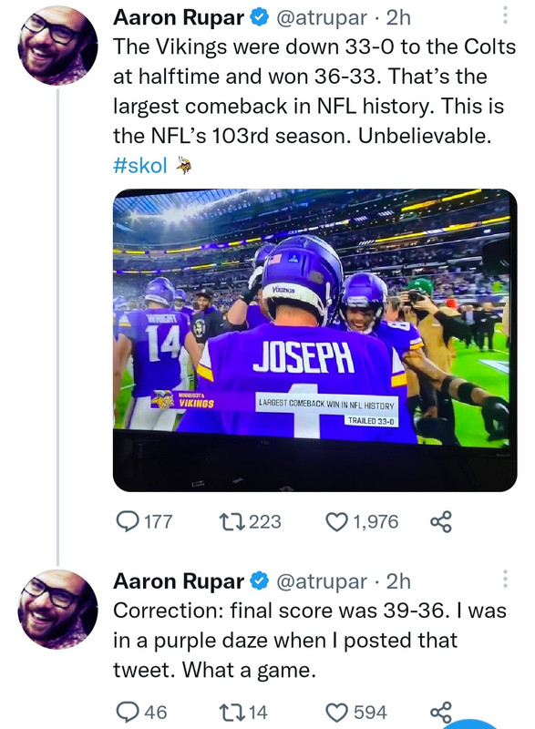 Actually, no, not this time. Between the phantom facemask call on the punt and the early whistle on the fumble return touchdown, the officials actually almost stopped the Vikings comeback all by themselves.