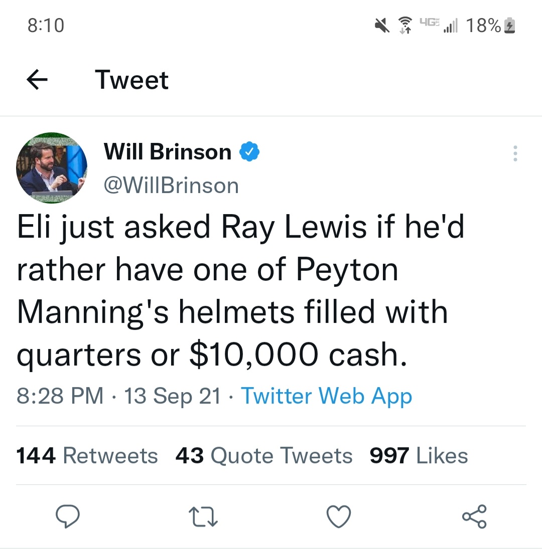 I will see if that’s true or just your pills talking when the Manning’s have Stabby Ray on.