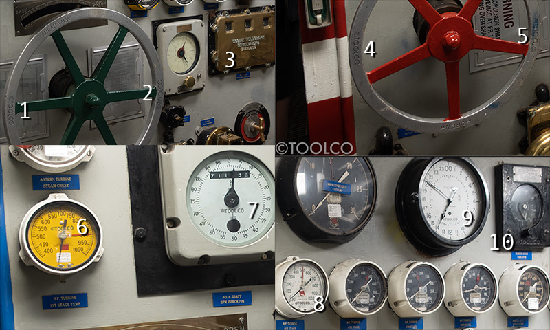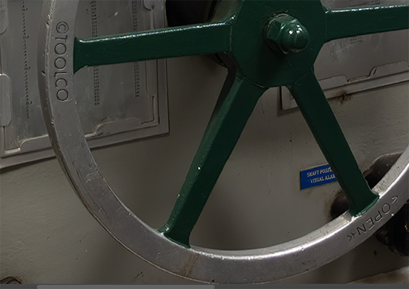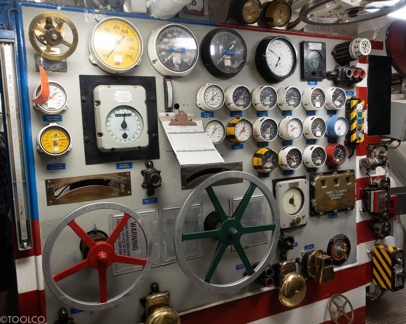 It’s the throttle station in the No.2 Engineroom of the battleship USS Iowa (BB-61) located in glamorous downtown San Pedro. The No.2 engineroom controls the No.4 main propeller shaft (of course it does because Navy) and that right-hand throttle wheel controls 53,000 shaft horse power in the ahead direction, turning an 18-foot diameter 20 ton propeller. Look at the indicator and you’ll see it opens seven individual poppet valves sequentially across the power range. The left hand wheel controls the astern throttle which is just one big dumb valve because this is only used for emergencies like when the 60,000 ton ship is about to crash into something and you need to stop stop stop right now.