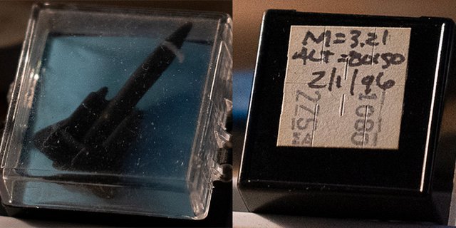 When they got out, one pilot had carried souvenir pins in his pocket and gave them out to the film crew. He marked the stats – Speed Mach 3.21 (2463 mph); Altitude 80,150 feet (15 miles high); Feb 1 1996: