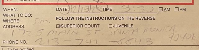 The last time I went to court in Santa Monica, the summons gave me room number in the S.M. Courthouse and to be there at 1 PM. So I was there. The room turned out to be where you pay parking tickets. The next week I got an undated letter telling me to go to the Airport Courthouse, with no new time. So I went there at 1 PM; the judge asked me why I wasn’t there at 9 AM so I showed him everything and he chewed out the district attorney and let me go. The only other defendant in the courtroom had on orange jail coveralls and was handcuffed to a chair.