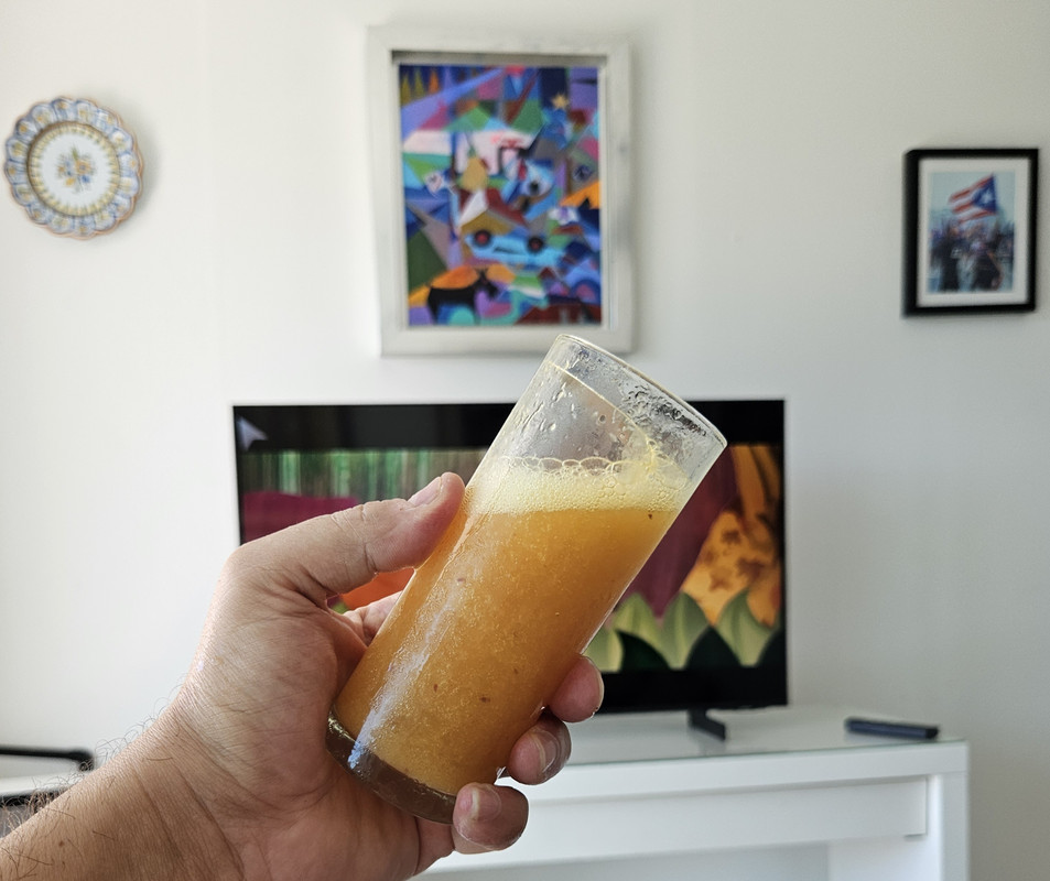 Mix (fresh mango + raspberry preserves + bit o’ grapefruit soda) came out barely ok. Smoothie thick, needed more presetves.